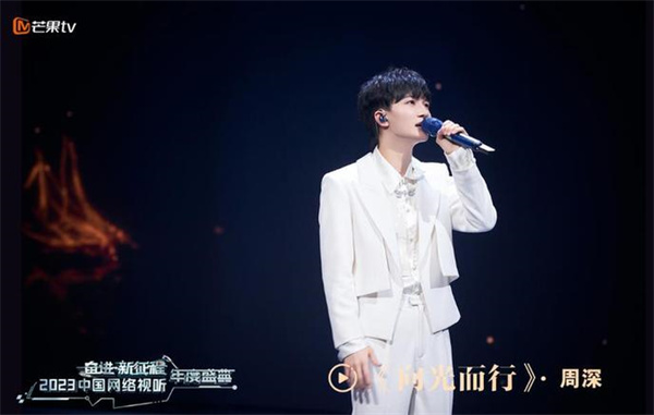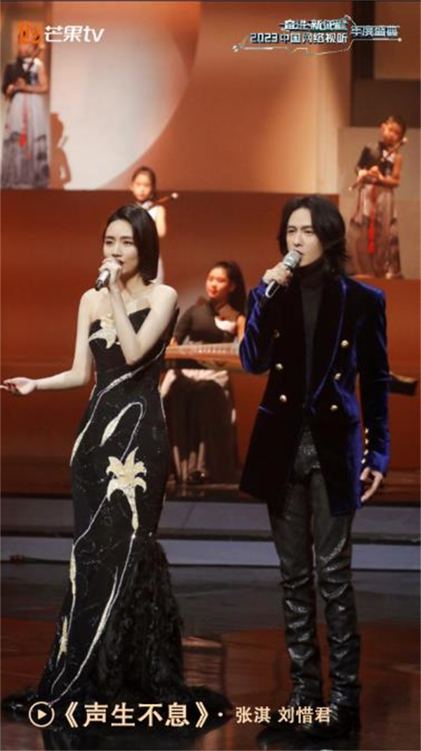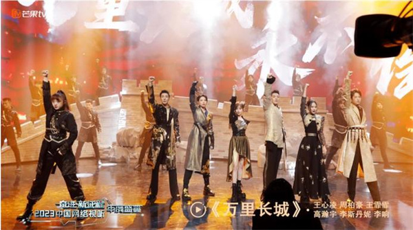 其三,以國風(fēng)元素呈現(xiàn)“青春中國”新圖景。近年來,推動傳統(tǒng)文化創(chuàng)造性轉(zhuǎn)化、創(chuàng)新性發(fā)展已成為網(wǎng)絡(luò)視聽行業(yè)的共同追求。國風(fēng)、國潮便是從民族文化中提煉出來的精神標(biāo)識,那么,異彩紛呈的創(chuàng)演舞臺如何通過國風(fēng)文化的創(chuàng)新融合為青春賦能呢?2023中國網(wǎng)絡(luò)視聽年度盛典中,節(jié)目《萬里長城》融合了傳統(tǒng)武術(shù)和國風(fēng)唱演的表演形式,在長城舞臺場景中利用3D立體卷軸、毛筆筆觸文字、國潮撞色等文化元素,實(shí)現(xiàn)東方審美的視覺表達(dá)。長城的雄渾壯美、戰(zhàn)甲式服裝以及武術(shù)風(fēng)格的舞蹈,共同呈現(xiàn)出和諧的整體美感,在審美層面?zhèn)鬟f華夏氣韻、彰顯時代精神。節(jié)目《聲生不息》巧妙運(yùn)用光影技術(shù),致力于新潮元素的表達(dá)亦與古風(fēng)相融。素雅的國風(fēng)唐裝配合舞臺背后流動的水墨云霧之景,祥云、龍紋的中國元素與特效技術(shù)的舞臺和諧交融,實(shí)現(xiàn)了中華傳統(tǒng)美學(xué)與現(xiàn)代審美觀念的深度結(jié)合。可以看到,網(wǎng)絡(luò)視聽節(jié)目以國風(fēng)為媒引領(lǐng)青春新風(fēng)潮,是融入傳統(tǒng)文化視野和當(dāng)代審美理念的一種藝術(shù)創(chuàng)造,既是古典的又是時尚的,從而產(chǎn)生出更持久、更磅礴的傳承和創(chuàng)新力量。