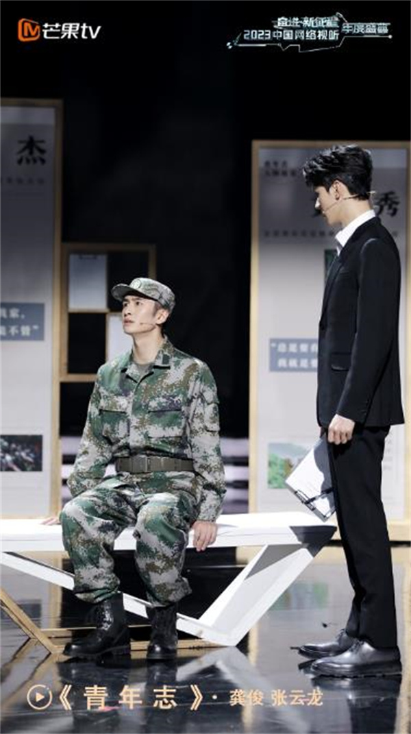 其二,以青年視角講述奮進(jìn)群像新故事。“人民”是文藝創(chuàng)作的源頭活水,2023中國網(wǎng)絡(luò)視聽年度盛典以當(dāng)代青年的視角,講述多行業(yè)群體的奮斗故事與感人事跡,串聯(lián)起中國人民團(tuán)結(jié)向前的奮斗印記。一方面,致敬了奮戰(zhàn)在一線的英雄形象。由張?jiān)讫垺徔〉妊堇[的跨時空對話情景劇《青年志》,聚焦“八一勛章”獲得者杜富國的英雄事跡,通過“穿越”的表現(xiàn)方式,開啟了一場時空穿梭與思想碰撞的青年對話,在一次次的詢問戰(zhàn)友、戰(zhàn)場情況中用真情實(shí)感禮贊平凡英雄。另一方面,歌頌了堅(jiān)守在普通崗位上平凡群體。節(jié)目《向光而行》借助VCR中真實(shí)景象和舞臺空間的交叉融合,當(dāng)代“愚公”毛相林、七一勛章獲得者張桂梅、神十五航天員張陸等當(dāng)代“追光者”一一閃耀熒屏,并以“那兔”形象刻畫出萬千中華兒女的奮斗群像,共同開啟“想要富足的生活,就用我們的雙手去創(chuàng)造”的奮進(jìn)故事。節(jié)目《青年志》結(jié)尾以賈宗洋、黃文秀、龍麻子為代表的青年形象為落點(diǎn),由點(diǎn)及面,彰顯一代中國青年亙古不變的責(zé)任與擔(dān)當(dāng)。這些作品以凝心聚力的價值導(dǎo)向,在講述中華兒女追夢、逐夢的奮斗故事之時,記錄了他們不懈奮斗的精神歷程。