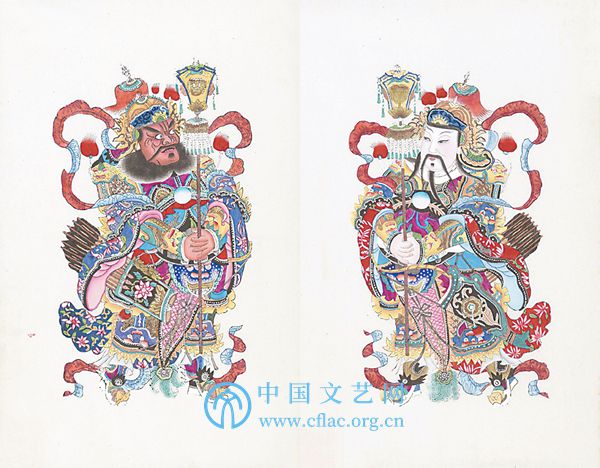 中國門神畫先以虎作為題材,畫于天子門上,到漢代才出現(xiàn)起源于古代神話故事的神荼、郁壘二人作門神的習(xí)俗。宋代,隨著手工業(yè)空前發(fā)展,出現(xiàn)了木版雕刻刷印的紙質(zhì)門神畫,除傳統(tǒng)的神荼、郁壘二人及武士,還出現(xiàn)了文臣朝官形象,形成了大門貼武士、院內(nèi)廳堂兩側(cè)貼文官的風(fēng)俗。自宋之后,門神的神性功能逐步淡化,門神形象多由通俗小說中的英雄人物擔(dān)任。