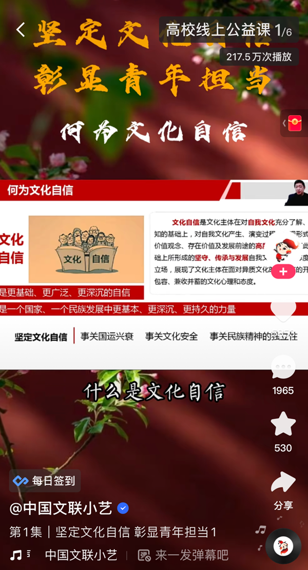 日前,由中國文藝網、中國青年網共同主辦的“堅定文化自信,彰顯青年擔當”2022年高校線上公益課活動在中國文藝網官方快手賬號“中國文聯小藝”上成功舉行。