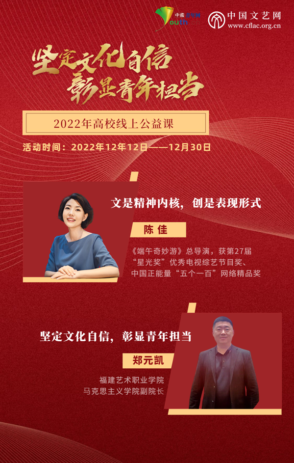 此次線上公益課程,旨在深入學習貫徹落實黨的二十大精神,傳承中華優秀傳統文化,助力提升國家文化軟實力和中華文化影響力,增強實現中華民族偉大復興的精神力量,讓網絡文藝助推高校青年文化自信自強。課程涵蓋“堅定文化自信,彰顯青年擔當”與“傳統文化的當代表達”兩個主題,邀請福建藝術職業學院馬克思主義學院副院長鄭元凱、河南衛視2021中國節日系列節目《端午奇妙游》總導演陳佳分別為學生授課。