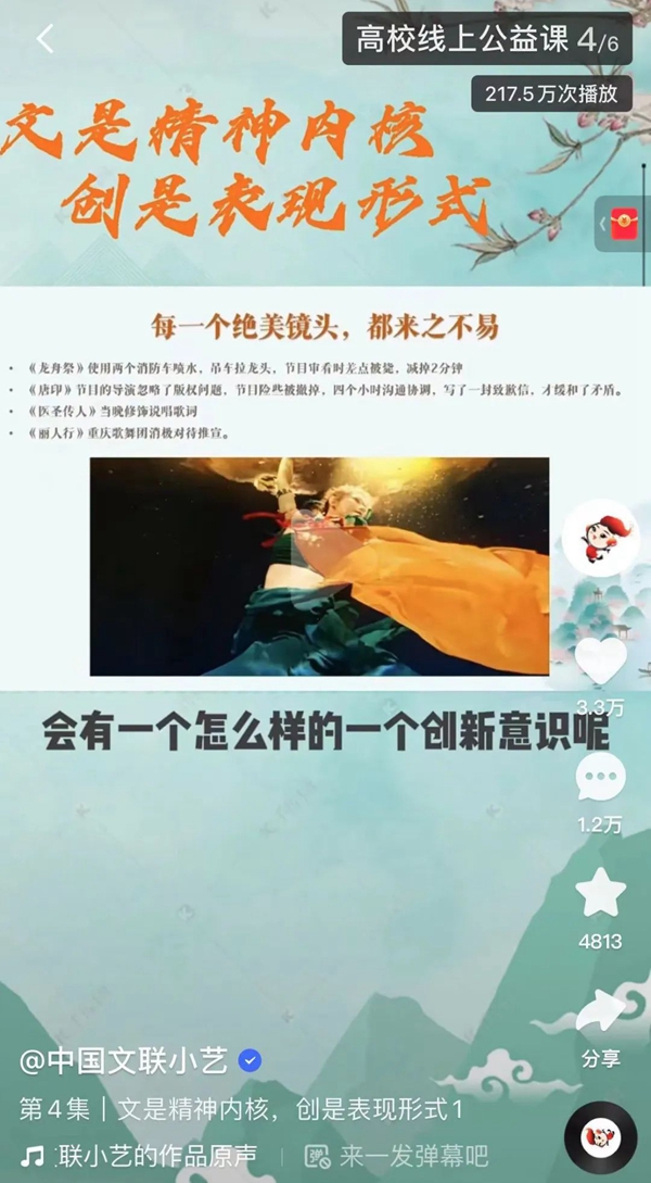 “堅定文化自信,彰顯青年擔當”2022年高校線上公益課活動是中國文藝網在快手平臺開展的短視頻培訓課程,既是對探索“互聯網+文藝”新型服務形式的積極嘗試,也是在疫情防控要求下開展工作的主動作為。這次培訓通過主流短視頻平臺開展,通過互聯網傳播中華優秀傳統文化的同時,也建立起全國知名專家學者與大學生之間的橋梁,在提升高校學生文化自信與藝術素養的同時,為高校第二課堂在新時代的創新提供實踐經驗。