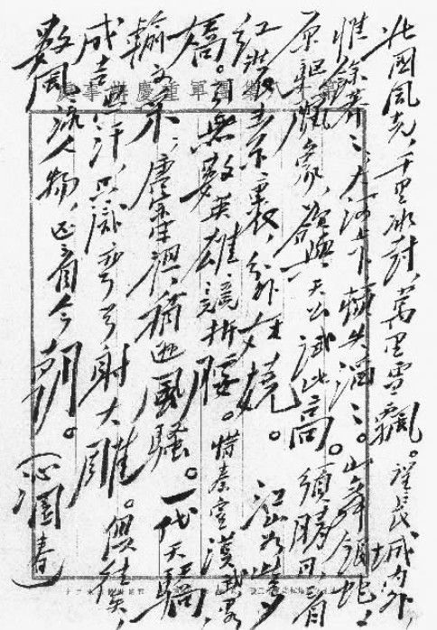 9月6日,毛在沙坪壩南開中學再見柳亞子,把一首寫在第十八集團軍重慶辦事處八線朱絲欄箋紙上的沁園春交與對方。這手跡豎寫,八行,全詞114字,有標點,遠超出朱絲格外,左下角加括弧寫了詞牌沁園春三字。毛附信說,這是初到陜北看見大雪時所填的一首詞,錄呈審正。翻查《毛澤東年譜》,確是有1936年2月上旬毛在陜西清澗縣準備東渡黃河時遇大雪的記錄。