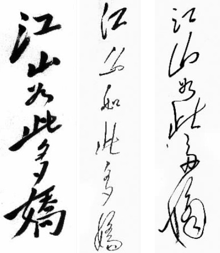 1959年,為慶祝中華人民共和國成立十周年,中央請傅抱石、關山月為北京人民大會堂繪制巨幅國畫《江山如此多嬌》,這畫題的六字就是取自毛的這首詞中,而且,是毛親自為此畫題的字。上世紀60年代前半期,毛還數次書寫過這首詞。下面,我們把40年代為柳亞子書詞中的這六字、題畫上的這六字(原橫排改為豎排)、60年代書詞中的這六字并列在一起,相信許多朋友會感興趣:52歲的毛,66歲的毛以及70歲上下的毛,其書法藝術呈現出哪些變化呢?