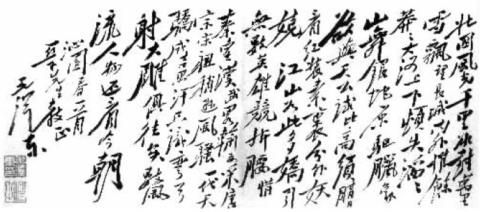 毛本人也很喜愛和珍重這首詞。何以見得?1996年,當毛逝世二十周年之際,中共中央有關機構認定并結集出版的毛詩詞作品67首,其中47首留有他自己書寫的手跡,累計約130件;而他書寫的這首《沁園春·雪》,至少有八件以上,唯有《清平樂·六盤山》一詞,書寫件數堪可相匹。北京出版社為紀念毛澤東誕辰120周年大舉推出的《毛澤東手跡·自作詩詞》卷把這八件手跡都收入了,相信廣大愛好者一定會歡迎的。這首詞盡管很長,但詩人把它牢牢地銘記在腦海中了,拿起筆來,詞句便如不絕的流水汩汩而出