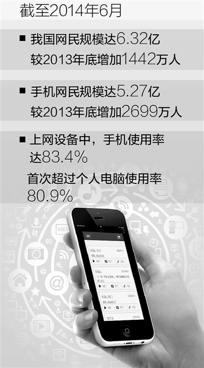 中國互聯(lián)網(wǎng)信息中心(CNNIC)今日發(fā)布的《第34次中國互聯(lián)網(wǎng)絡(luò)發(fā)展?fàn)顩r統(tǒng)計(jì)報(bào)告》顯示,截至今年6月,我國手機(jī)網(wǎng)民達(dá)5.27億,較2013年底增加2699萬人,手機(jī)上網(wǎng)使用率達(dá)83.4%,首次超過個(gè)人電腦(僅包括臺(tái)式機(jī)和筆記本,不包含平板電腦等新興個(gè)人終端設(shè)備)。