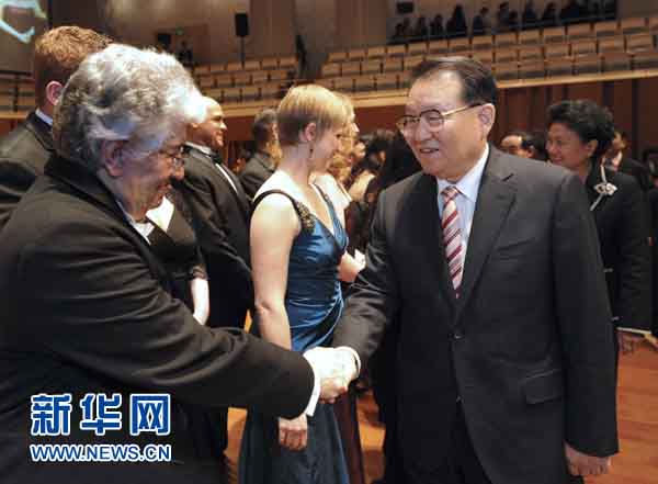 12月12日,第六屆孔子學院大會開幕式在北京國家大劇院舉行。中共中央政治局常委李長春出席開幕式,并為全球孔子學院先進個人和突出貢獻獎獲獎者頒獎,觀看外國歌唱家我唱北京音樂會。這是音樂會結束后,李長春走上舞臺,與演員親切握手。