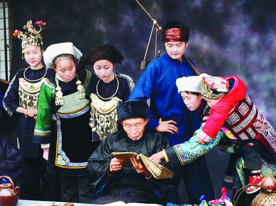 文化大發展大繁榮離不開民間文化。被列入第一批國家級非物質文化遺產名錄的水書是水族先民創制的別具一格的象形文字,也指用這種象形文字撰寫而成的大量典籍,通過手抄配合口傳心授的大量內容。水書在水族人民的喪葬、祭祀、營建、婚嫁、出行、節令、占卜、農事等活動中發揮著一種指令規范作用,歷經數千年的傳承發展至今,形成了固有的文字體系和地域文化特征,被譽為水族的百科全書。圖為貴州水族居民在看水書。