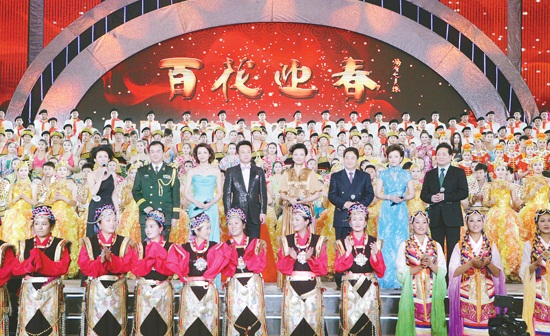 百花迎春中國文學藝術界大聯歡,是全國文藝界的大集結、大檢閱,也是全國文藝工作者一年一度的全家福。今年的全家福,在中華巨龍金色盛裝的裝扮下,節日氣氛格外喜慶熱烈。2011年是十二五開局之年,也是中國共產黨成立90周年和辛亥革命100周年,更是黨的十七屆六中全會、第九次全國文代會勝利召開,吹響推動文化大發展大繁榮、建設社會主義文化強國號角的一年;剛剛到來的2012年,繼續深入貫徹落實黨的十七屆六中全會精神和第九次全國文代會精神,喜迎黨的十八大勝利召開,來自全國各地各藝術門類的文藝工作者,濟濟一堂,歡聲笑語,共同表達對祖國和人民的真誠祝福,對時代和生活的熱情禮贊。