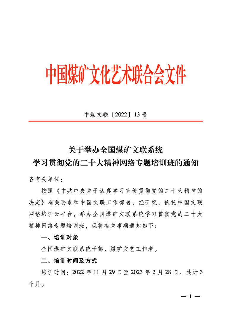 關于舉辦全國煤礦文聯系統學習貫徹黨的二十大精神網絡培訓班的通知 來源: 作者: 時間:2022-11-30 【字體:小 大】 附件1 關于舉辦全國煤礦文聯系統學習貫徹黨的二十大精神網絡培訓班的通知.pdf附件2 全國煤礦文聯系統學習貫徹黨的二十大精神網絡專題培訓班學員信息統計表.xlsx 分享到: 【打印正文】