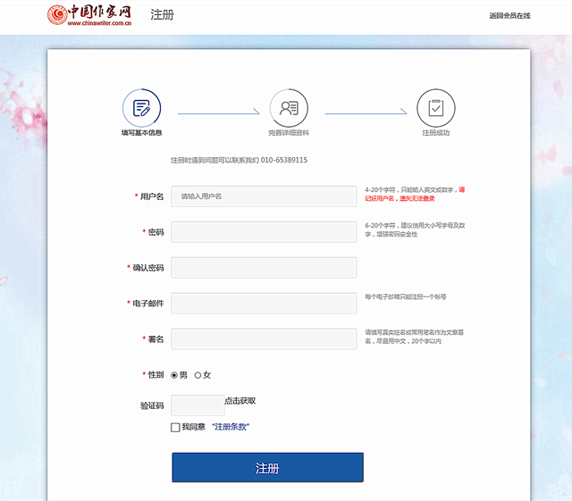 暫未注冊、有意愿參賽的文學愛好者可先行注冊成為中國作家網(wǎng)原創(chuàng)用戶,再行投稿。具體注冊流程如下圖所示:
