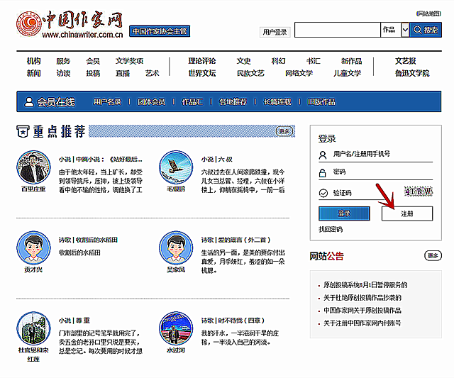 2018年,為不斷增強中國作家網(wǎng)的群眾性,切實提升服務(wù)水準,網(wǎng)站設(shè)立原創(chuàng)頻道,至今為止,網(wǎng)站注冊會員5萬余人,上傳詩歌、散文、小說、報告文學等各類文學作品近30萬篇,優(yōu)秀文學作品層出不窮,極大豐富了網(wǎng)站文學園地。網(wǎng)站設(shè)立了首頁推薦,每天從注冊會員上傳的幾百篇作品中挑選8篇進行重點推薦,同時對活躍度較高的注冊用戶進行重點推介,給廣大文學寫作者帶來了通暢的展示與傳播渠道。