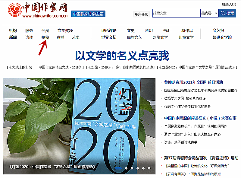 1. 首先登錄中國作家網(wǎng)http://www.chinawriter.com.cn/ 在首頁頂端頻道分類位置找到“投稿”(標紅色箭頭處),點擊進入原創(chuàng)頻道。