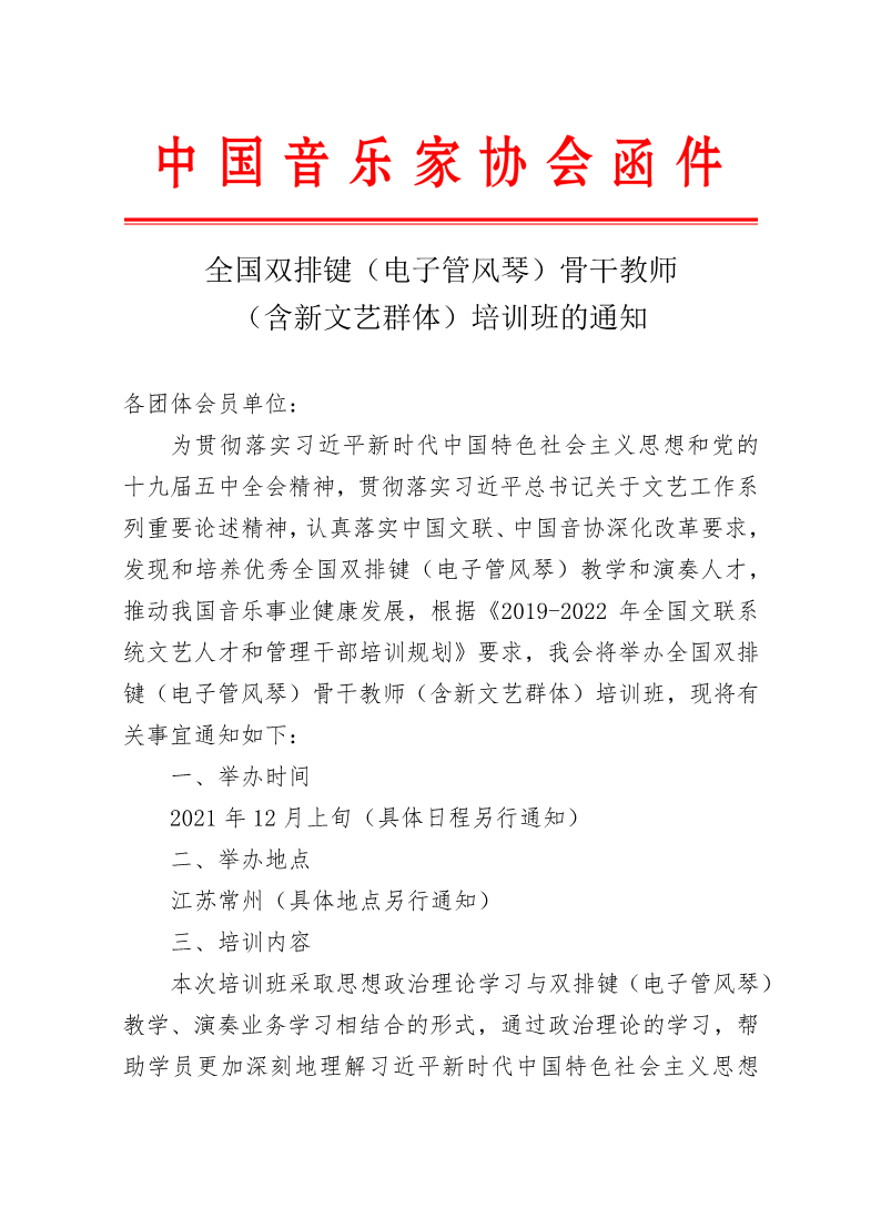 轉(zhuǎn)發(fā)中國音樂家協(xié)會《全國雙排鍵(電子管風(fēng)琴)骨干教師 (含新文藝群體)培訓(xùn)班的通知 》