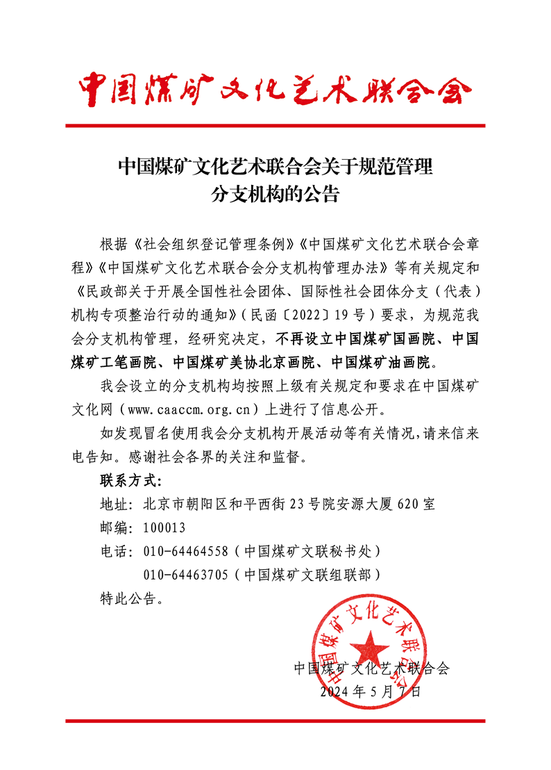 中國煤礦文化藝術聯合會關于規范管理分支機構的公告