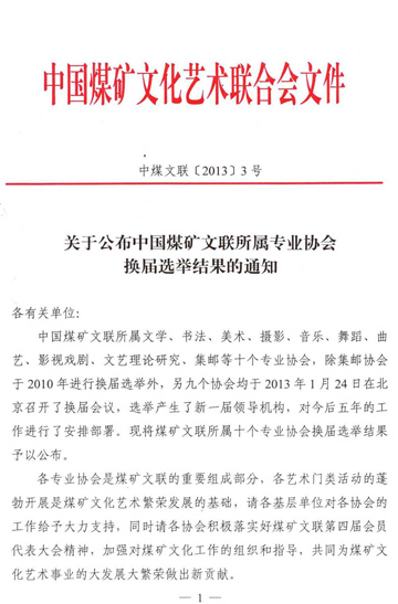 關(guān)于公布中國(guó)煤礦文聯(lián)所屬專業(yè)協(xié)會(huì)換屆選舉結(jié)果的通知 來(lái)源:中國(guó)煤礦文化網(wǎng) 作者: 時(shí)間:2014-03-06 【字體:小 大】 附件:中國(guó)煤礦文聯(lián)所屬專業(yè)協(xié)會(huì)換屆選舉結(jié)果 分享到: 【打印正文】