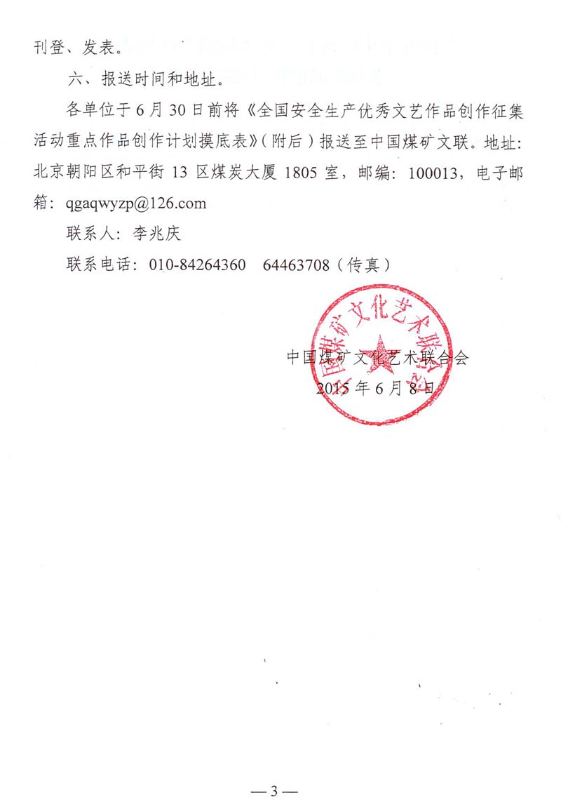 關于報送全國安全生產(chǎn)優(yōu)秀文藝作品創(chuàng)作征集活動重點作品創(chuàng)作計劃的通知 來源: 作者: 時間:2015-06-12 【字體:小 大】 附件:全國安全生產(chǎn)優(yōu)秀文藝作品創(chuàng)作征集活動重點作品創(chuàng)作計劃摸底表 智能標簽: 安全生產(chǎn) 文藝作品 創(chuàng)作 征集 相關內容 分享到: 【打印正文】
