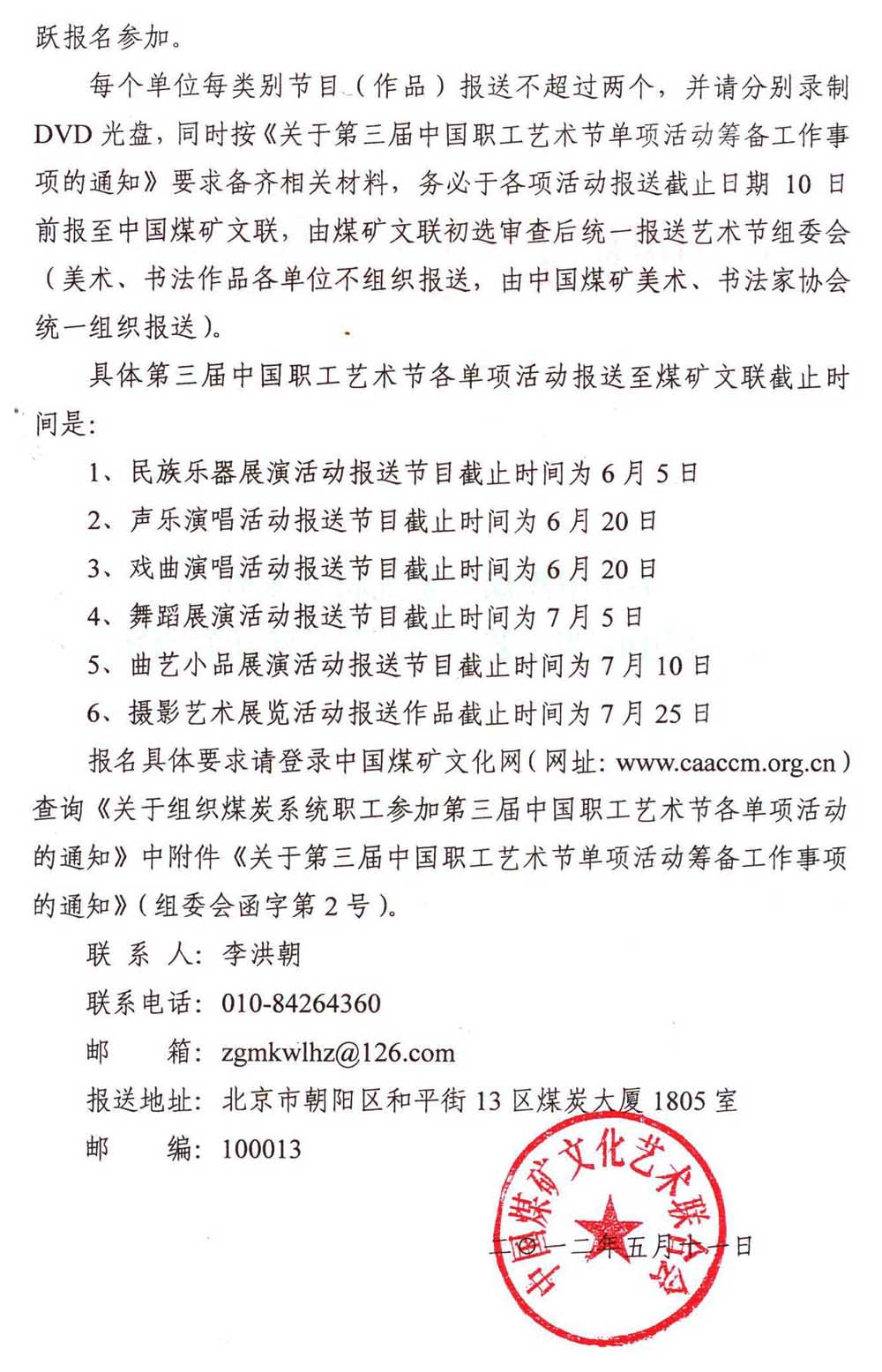 關(guān)于組織煤炭系統(tǒng)職工參加第三屆中國(guó)職工藝術(shù)節(jié)各單項(xiàng)活動(dòng)的通知 來(lái)源:中國(guó)煤礦文化網(wǎng) 作者:煤礦文聯(lián) 時(shí)間:2012-05-11 【字體:小 大】 附:關(guān)于第三屆中國(guó)職工藝術(shù)節(jié)單項(xiàng)活動(dòng)籌備工作事項(xiàng)的通知(組委會(huì)函字第2號(hào)) 分享到: 【打印正文】