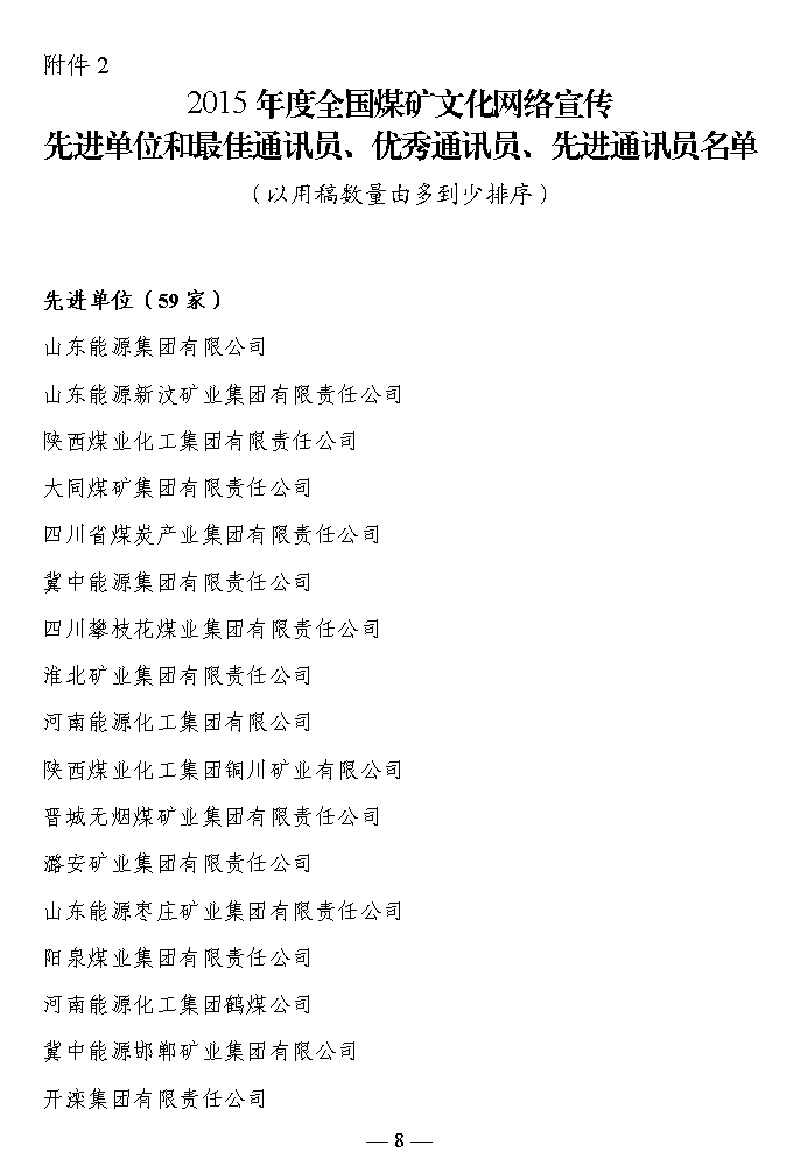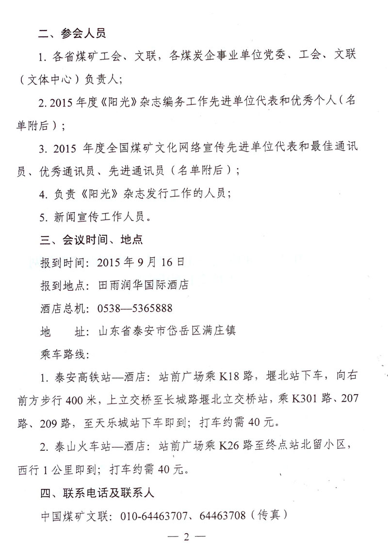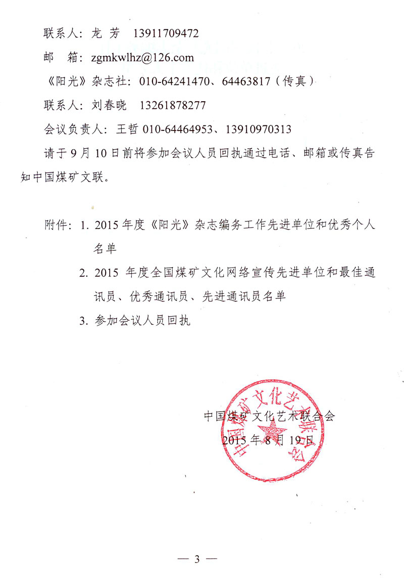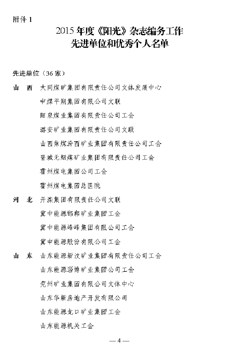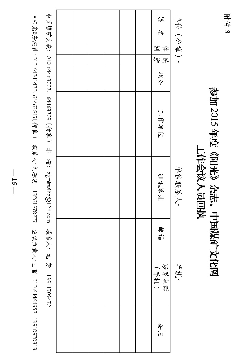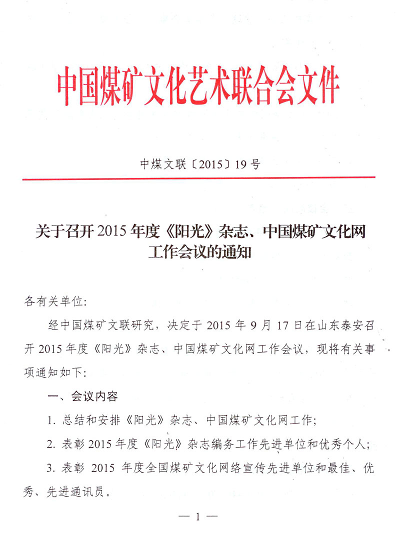 關(guān)于召開(kāi)2015年度《陽(yáng)光》雜志、中國(guó)煤礦文化網(wǎng)工作會(huì)議的通知 來(lái)源: 作者: 時(shí)間:2015-08-21 【字體:小 大】 附件: 1. 2015年度《陽(yáng)光》雜志編務(wù)工作先進(jìn)單位和優(yōu)秀個(gè)人 名單 2. 2015年度全國(guó)煤礦文化網(wǎng)絡(luò)宣傳先進(jìn)單位和最佳通 訊員、優(yōu)秀通訊員、先進(jìn)通訊員名單 3. 參加會(huì)議人員回執(zhí) 智能標(biāo)簽: 陽(yáng)光 煤礦文化網(wǎng) 相關(guān)內(nèi)容 分享到: 【打印正文】