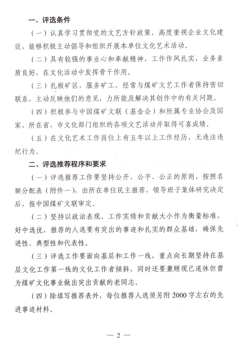 關于籌備召開中國煤礦文聯成立20周年座談會暨推選為繁榮煤礦文化藝術事業做出突出貢獻的文化藝術工作者的通知 來源: 作者: 時間:2015-10-30 【字體:小 大】 附件一:為繁榮煤礦文化藝術事業做出突出貢獻的文化藝術工作者名額分配表 附件二:為繁榮煤礦文化藝術事業做出突出貢獻的文化藝術工作者推薦表 智能標簽: 煤礦文聯 工作者 相關內容 分享到: 【打印正文】