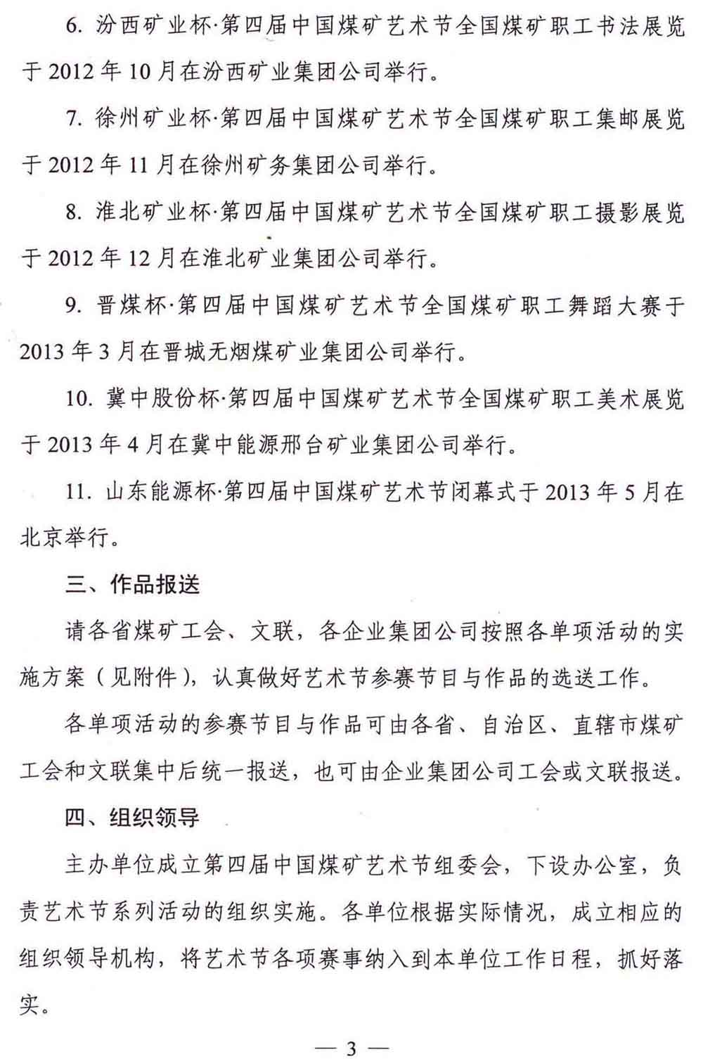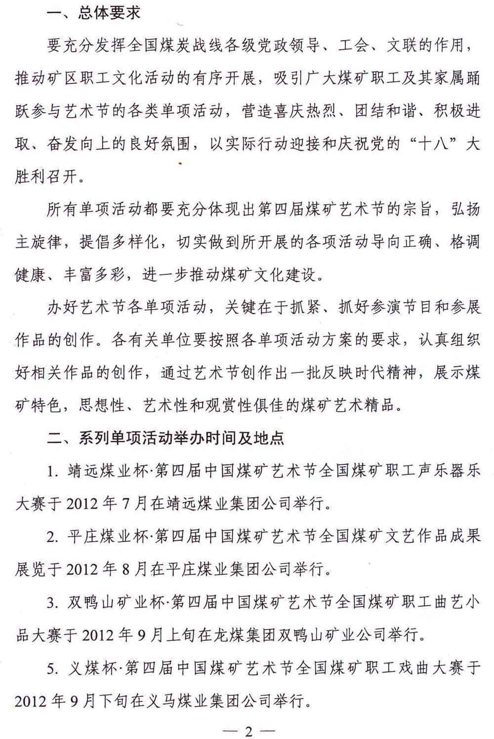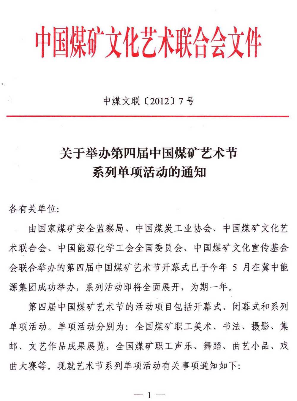 關于舉辦第四屆中國煤礦藝術節系列單項活動的通知 來源:中國煤礦文化網 作者:煤礦文聯 時間:2012-06-01 【字體:小 大】 附件:第四屆中國煤礦藝術節組委會名單、系列單項活動方案及報送表 分享到: 【打印正文】