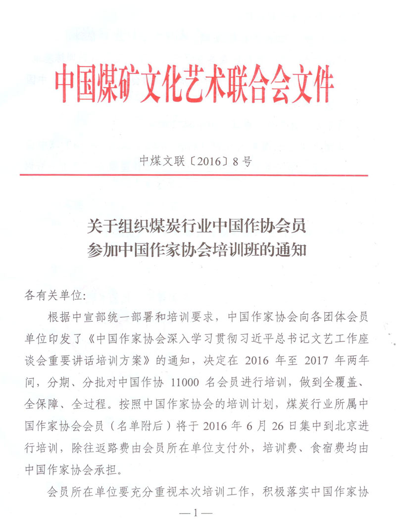 關(guān)于組織煤炭行業(yè)中國作協(xié)會員參加中國作家協(xié)會培訓(xùn)班的通知 來源:中國煤礦文聯(lián) 作者: 時間:2016-06-01 【字體:小 大】 附件:煤炭行業(yè)中國作協(xié)會員參加培訓(xùn)人員名單 中國作家協(xié)會深入學(xué)習(xí)貫徹習(xí)近平總書記文藝工作座談會重要講話培訓(xùn)方案 智能標(biāo)簽: 中國作家協(xié)會 相關(guān)內(nèi)容 分享到: 【打印正文】