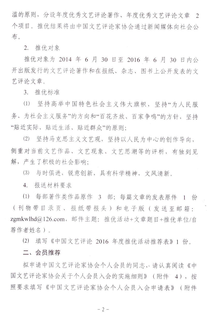 關(guān)于參加“中國(guó)文藝評(píng)論2016年度推優(yōu)活動(dòng)”和推薦中國(guó)文藝評(píng)論家協(xié)會(huì)個(gè)人會(huì)員的通知 來(lái)源:中國(guó)煤礦文聯(lián) 作者: 時(shí)間:2016-07-22 【字體:小 大】 附件1:中國(guó)文藝評(píng)論2016年度推優(yōu)活動(dòng)推薦表 附件2:中國(guó)文藝評(píng)論家協(xié)會(huì)個(gè)人會(huì)員入會(huì)申請(qǐng)表 附件3:《中國(guó)文藝評(píng)論家協(xié)會(huì)個(gè)人會(huì)員入會(huì)申請(qǐng)表》填表說(shuō)明 附件4:中國(guó)文藝評(píng)論家協(xié)會(huì)關(guān)于個(gè)人會(huì)員入會(huì)的實(shí)施細(xì)則 智能標(biāo)簽: 中國(guó)文藝評(píng)論 相關(guān)內(nèi)容 分享到: 【打印正文】
