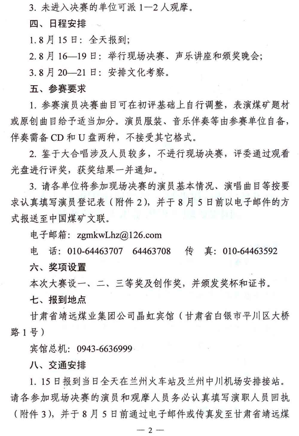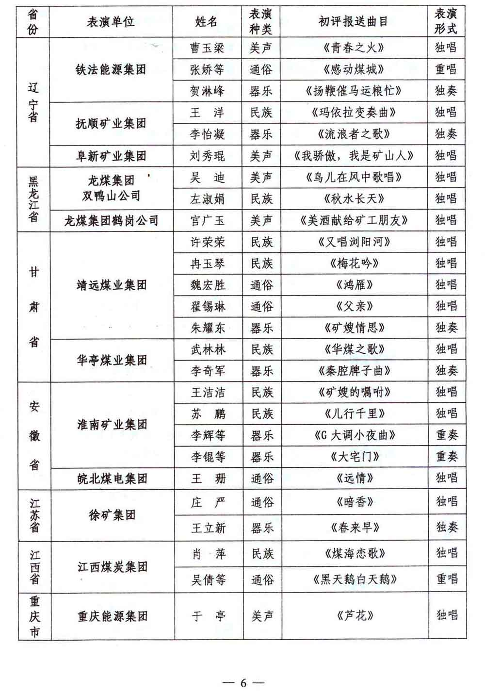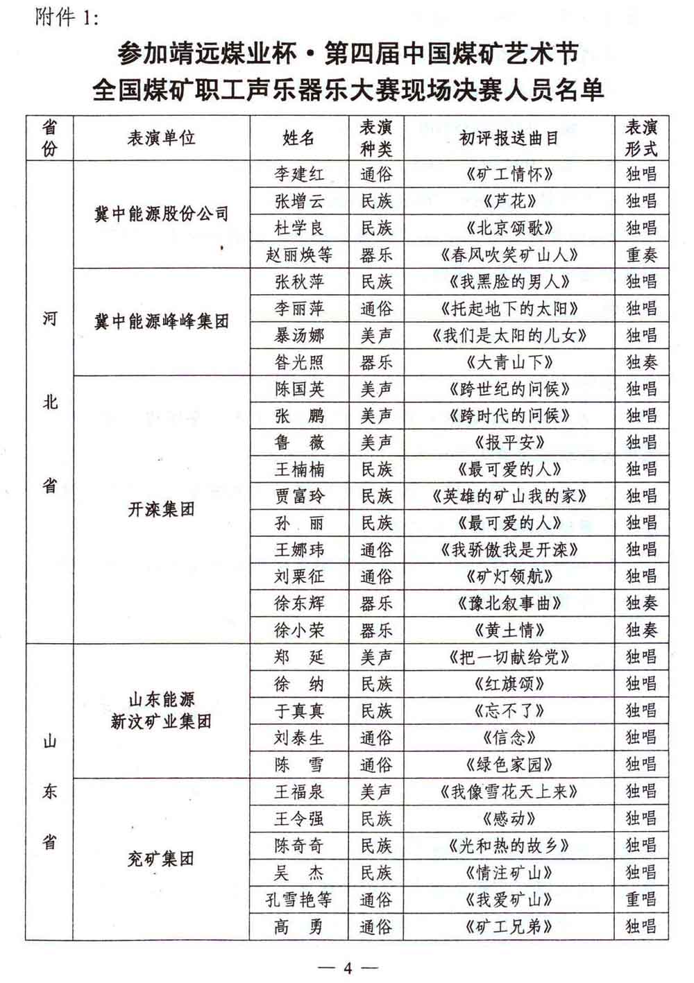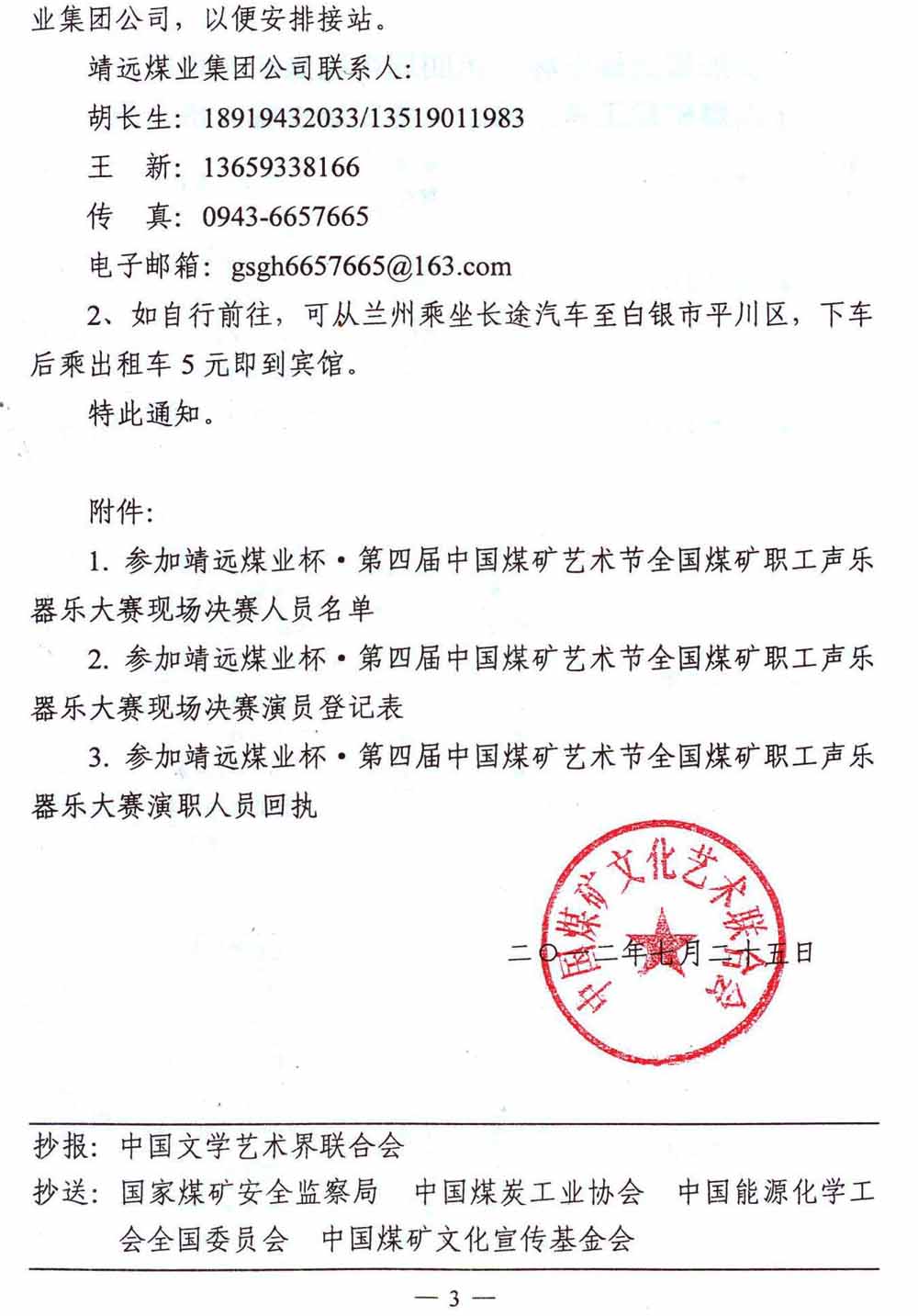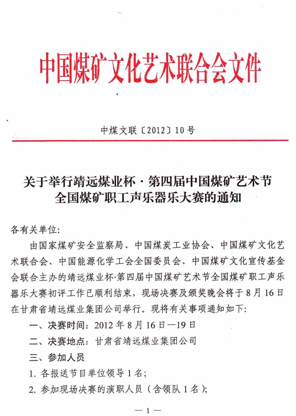 關(guān)于舉行靖遠(yuǎn)煤業(yè)杯·第四屆中國(guó)煤礦藝術(shù)節(jié)全國(guó)煤礦職工聲樂(lè)器樂(lè)大賽的通知 來(lái)源:中國(guó)煤礦文化網(wǎng) 作者:煤礦文聯(lián) 時(shí)間:2012-07-27 【字體:小 大】 附件:參加靖遠(yuǎn)煤業(yè)杯第四屆中國(guó)煤礦藝術(shù)節(jié)全國(guó)煤礦職工聲樂(lè)器樂(lè)大賽現(xiàn)場(chǎng)決賽演員登記表及演職人員回執(zhí) 分享到: 【打印正文】