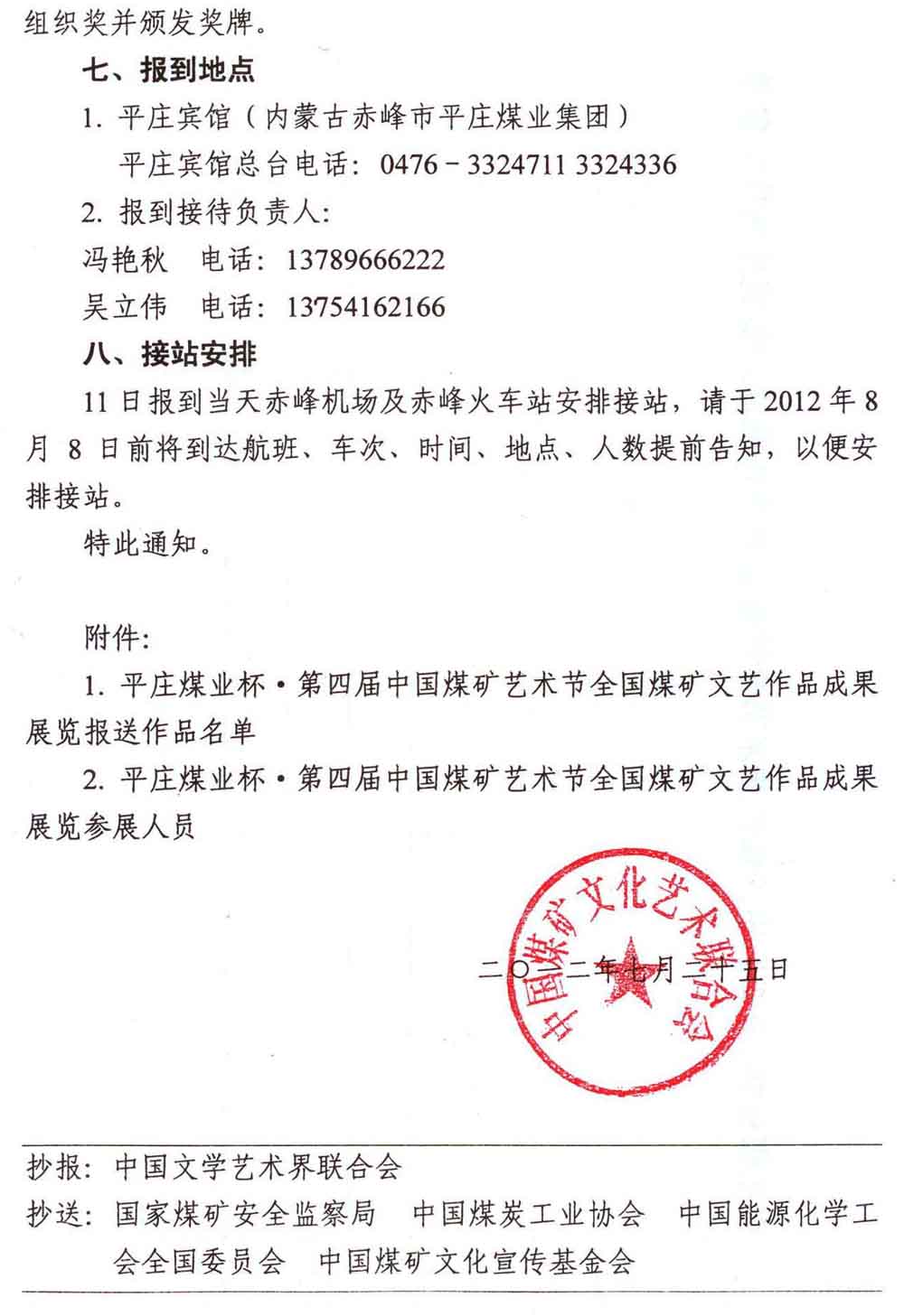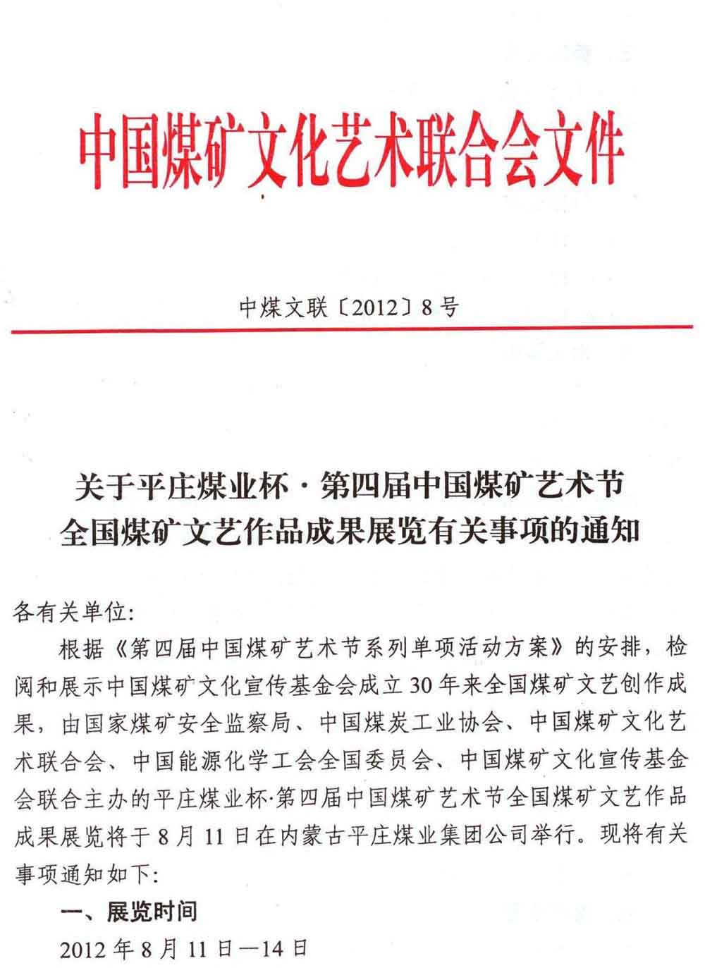 關于平莊煤業杯·第四屆中國煤礦藝術節全國煤礦文藝作品成果展覽有關事項的通知 來源:中國煤礦文化網 作者:煤礦文聯 時間:2012-07-27 【字體:小 大】 附件:平莊煤業杯·第四屆中國煤礦藝術節全國煤礦文藝作品成果展覽報送作品名單及參展人員回執 分享到: 【打印正文】