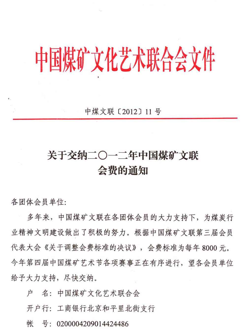 關(guān)于交納二〇一二年中國(guó)煤礦文聯(lián)會(huì)費(fèi)的通知 來(lái)源:中國(guó)煤礦文化網(wǎng) 作者:煤礦文聯(lián) 時(shí)間:2012-07-27 【字體:小 大】 分享到: 【打印正文】