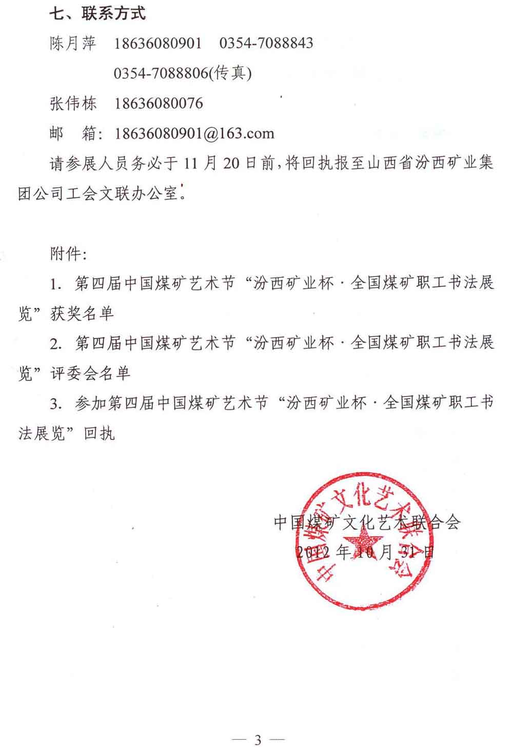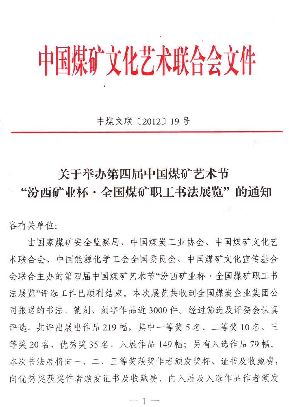 關(guān)于舉辦第四屆中國(guó)煤礦藝術(shù)節(jié)“汾西礦業(yè)杯全國(guó)煤礦職工書(shū)法展覽”的通知 來(lái)源:中國(guó)煤礦文化網(wǎng) 作者:煤礦文聯(lián) 時(shí)間:2012-11-07 【字體:小 大】 附件: 1.第四屆中國(guó)煤礦藝術(shù)節(jié)汾西礦業(yè)杯全國(guó)煤礦職工書(shū)法展覽獲獎(jiǎng)名單 2.第四屆中國(guó)煤礦藝術(shù)節(jié)汾西礦業(yè)杯全國(guó)煤礦職工書(shū)法展覽評(píng)委會(huì)名單 3.參加第四屆中國(guó)煤礦藝術(shù)節(jié)汾西礦業(yè)杯全國(guó)煤礦職工書(shū)法展覽回執(zhí) 分享到: 【打印正文】