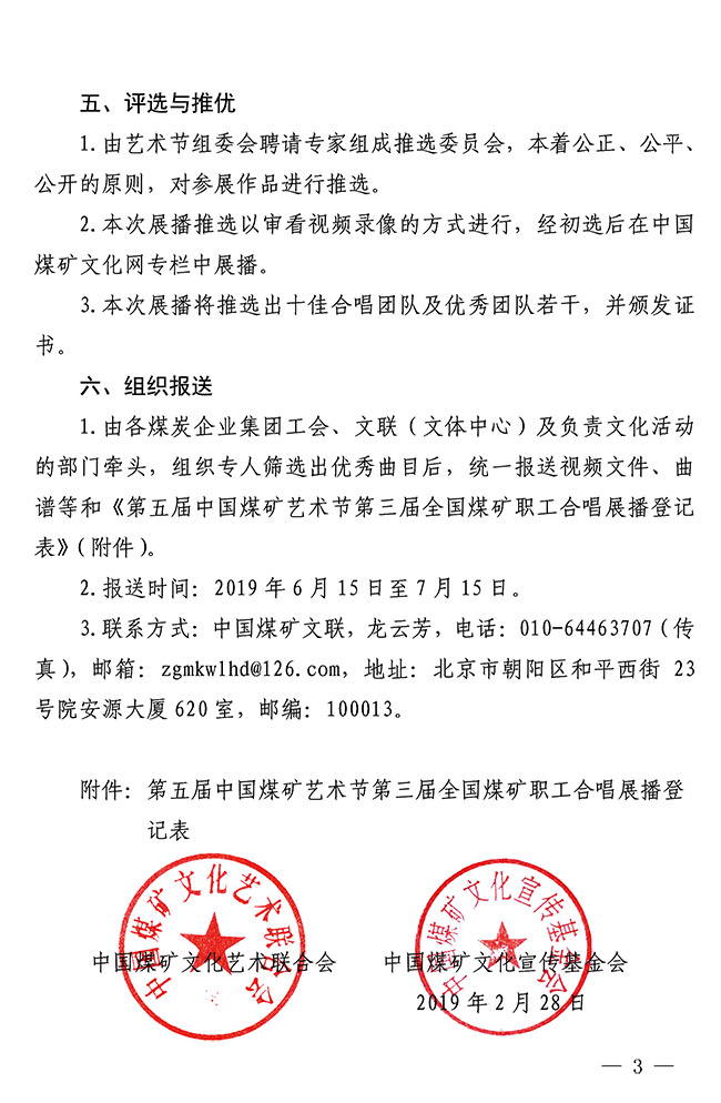 關于舉辦第三屆全國煤礦職工合唱展播活動的通知 來源:中國煤礦文聯 作者: 時間:2019-03-11 【字體:小 大】 關于舉辦第五屆中國煤礦藝術節第三屆全國煤礦職工合唱展播活動的通知(PDF版)附件:第五屆中國煤礦藝術節第三屆全國煤礦職工合唱展播登記表 智能標簽: 中國煤礦藝術節 相關內容 分享到: 【打印正文】