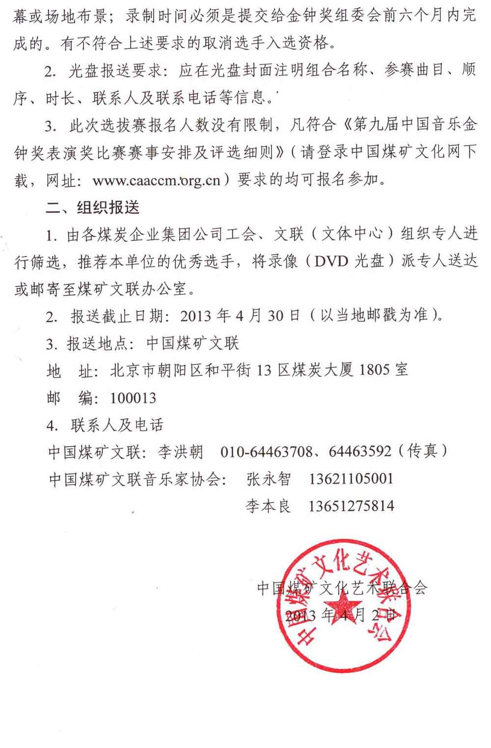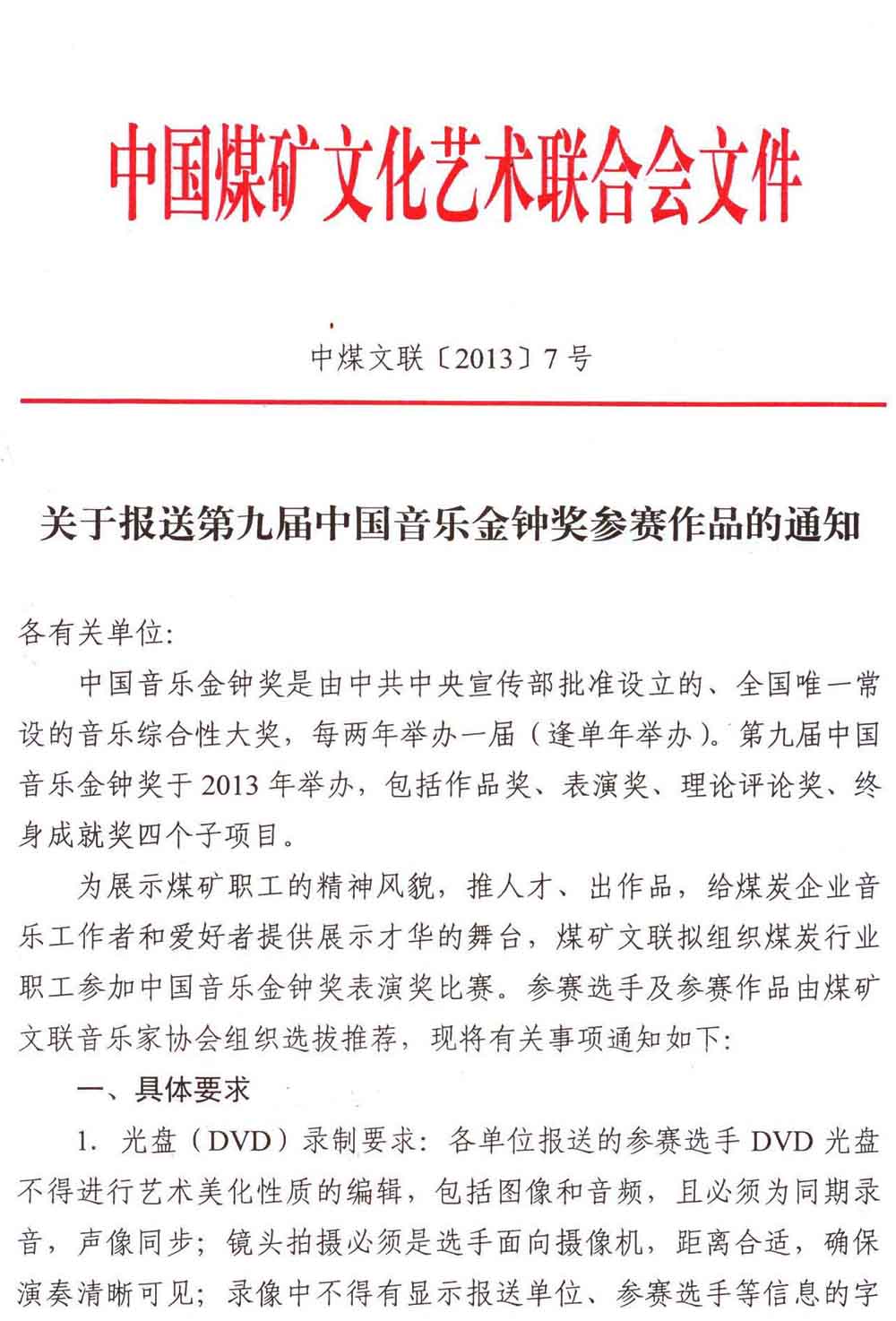 關于報送第九屆中國音樂金鐘獎參賽作品的通知 來源:中國煤礦文化網 作者:煤礦文聯 時間:2013-04-07 【字體:小 大】 附件: 1.第九屆中國音樂金鐘獎表演比賽賽事安排及評選細則 2.第九屆中國音樂金鐘獎聲樂比賽(民族)推薦選手登記表 3.第九屆中國音樂金鐘獎聲樂比賽(美聲)推薦選手登記表 分享到: 【打印正文】