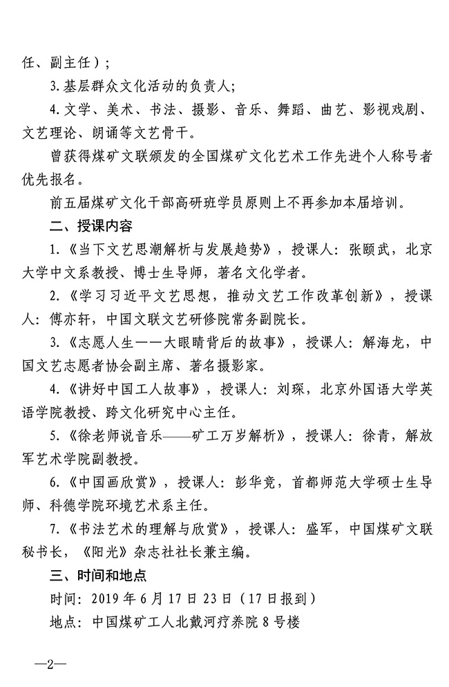 關(guān)于舉辦第六屆煤礦文化干部高研班的通知 來源:中國(guó)煤礦文聯(lián) 作者: 時(shí)間:2019-05-20 【字體:小 大】 附件:關(guān)于舉辦第六屆煤礦文化干部高研班的通知(PDF版)第六屆煤礦文化干部高研班報(bào)名表 智能標(biāo)簽: 中國(guó)煤礦文聯(lián) 相關(guān)內(nèi)容 分享到: 【打印正文】
