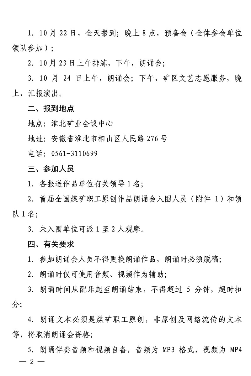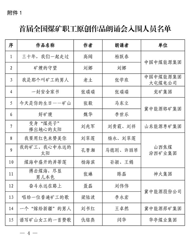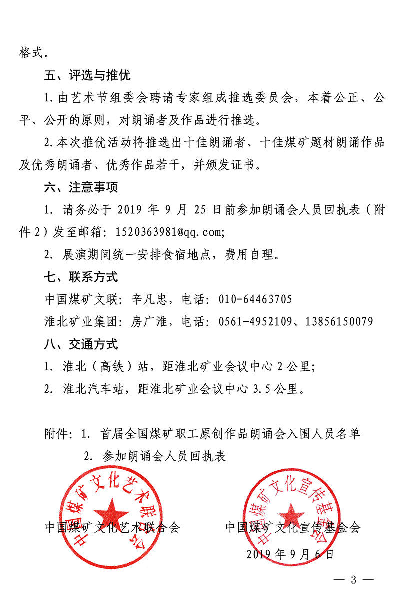 關于參加首屆全國煤礦職工原創作品朗誦會的通知 來源:中國煤礦文聯 作者: 時間:2019-09-20 【字體:小 大】 附件:· 關于參加“慶祝新中國成立70周年”第五屆中國煤礦藝術節“淮北礦業杯”首屆全國煤礦職工原創作品朗誦會的通知(PDF版,含附件1)· 參加朗誦會人員回執表(附件2) 智能標簽: 中國煤礦文聯 中國煤礦藝術節 相關內容 分享到: 【打印正文】