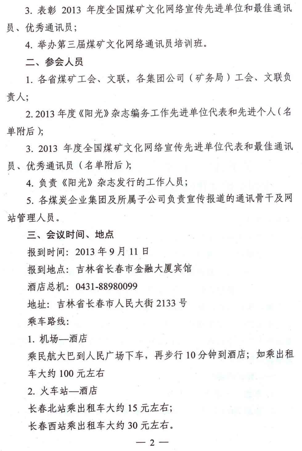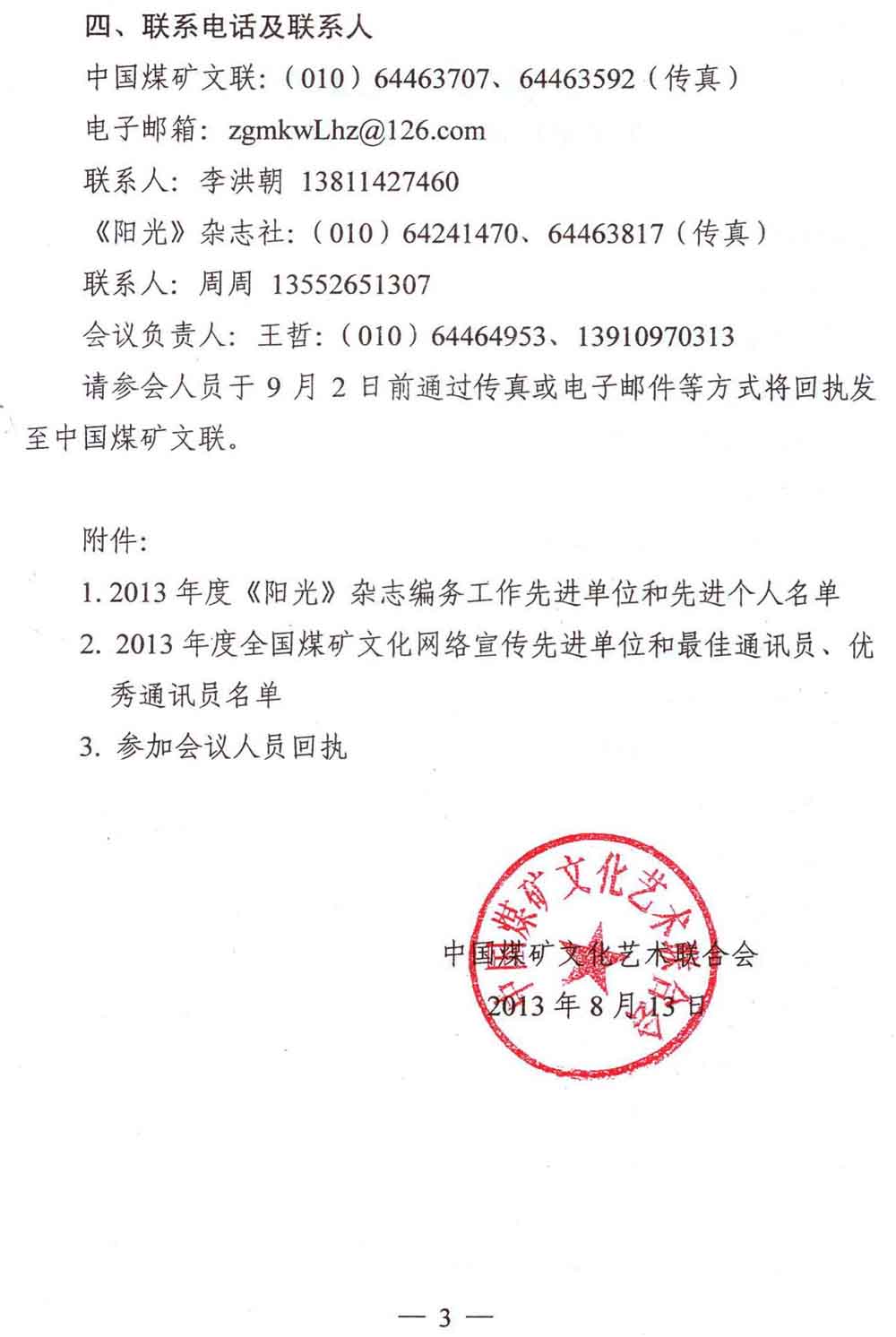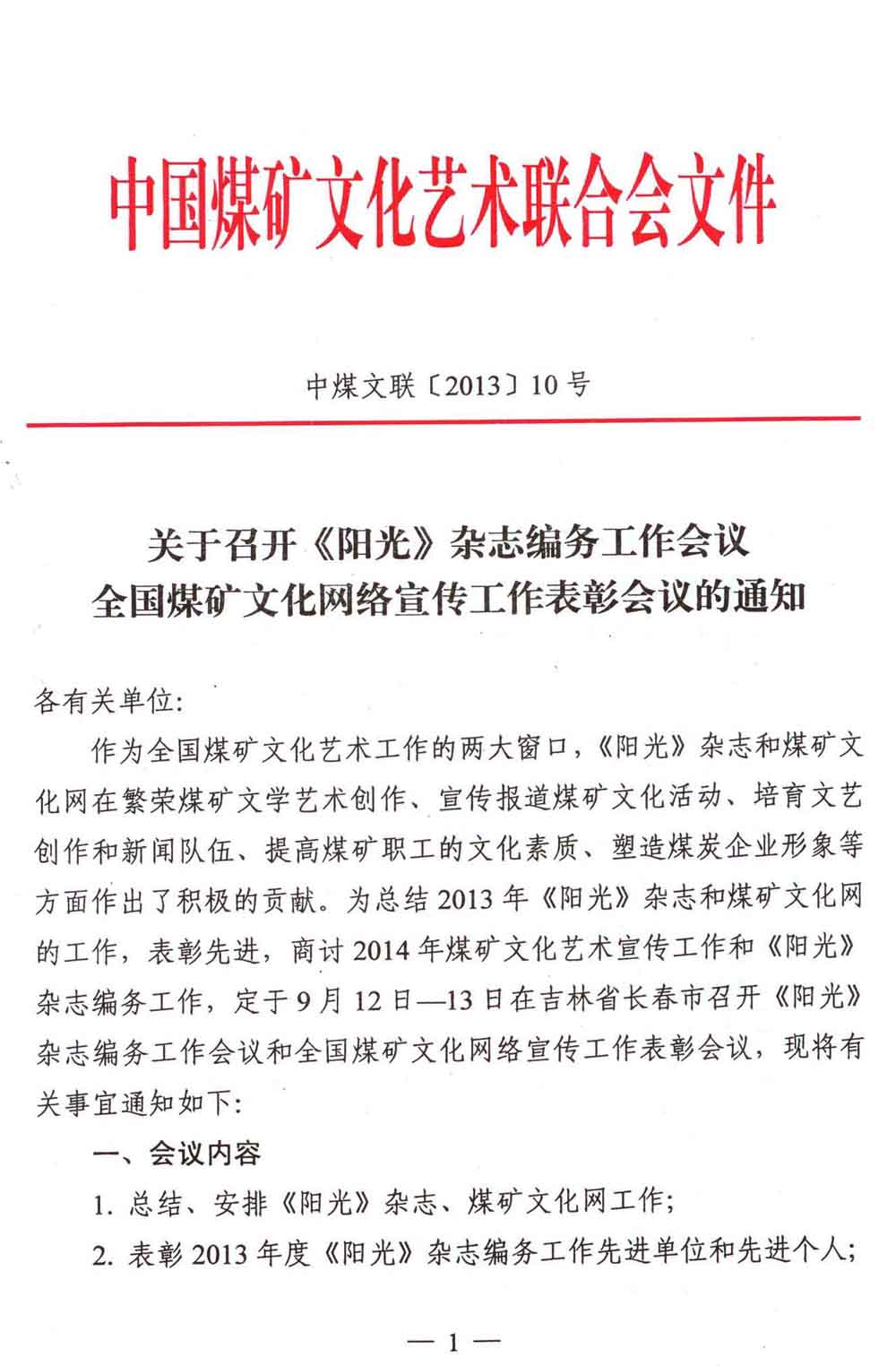 關于召開《陽光》雜志編務工作會議暨全國煤礦文化網絡宣傳工作表彰會議的通知 來源:中國煤礦文化網 作者:煤礦文聯 時間:2013-08-16 【字體:小 大】 附件:參加《陽光》雜志編務工作會議和全國煤礦文化網絡宣傳工作表彰會議人員回執 分享到: 【打印正文】