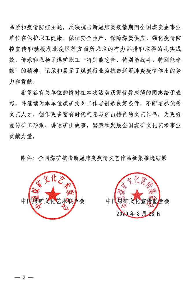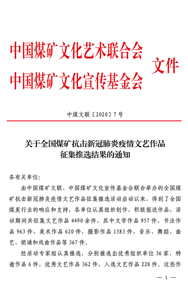關于全國煤礦抗擊新冠肺炎疫情文藝作品征集推選結果的通知 來源:中國煤礦文聯 作者: 時間:2020-09-03 【字體:小 大】 附件:關于全國煤礦抗擊新冠肺炎疫情文藝作品征集推選結果的通知(PDF版) 分享到: 【打印正文】