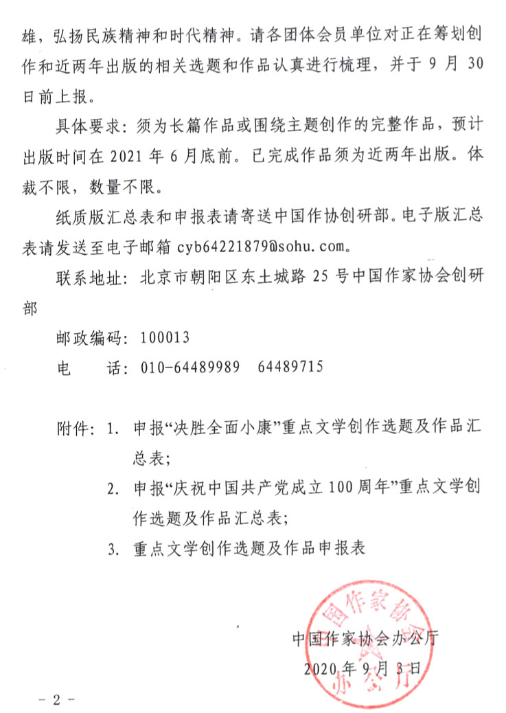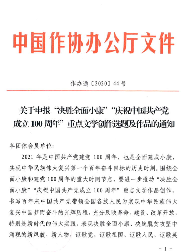 中國作協(xié):關(guān)于申報“決勝全面小康”“慶祝中國共產(chǎn)黨成立100周年”重點文學(xué)創(chuàng)作選題及作品的通知