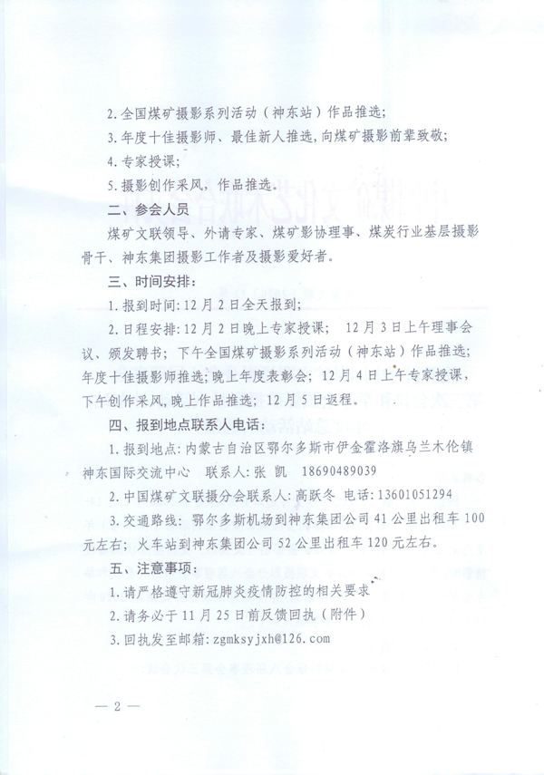 關(guān)于召開中國煤礦文聯(lián)攝影分會八屆理事會第三次會議和舉辦全國煤礦攝影系列活動(神東站) 年度總站活動的通知 來源:中國煤礦文聯(lián)攝影家協(xié)會 作者:中國煤礦文聯(lián)攝影家協(xié)會 時間:2020-11-10 【字體:小 大】 附件:1.中國煤礦文聯(lián)攝影分會八屆理事會理事名單 2.2019年度全國煤礦攝影十佳候選人名單 3.部分重點作者 4.參加活動人員回執(zhí) 分享到: 【打印正文】