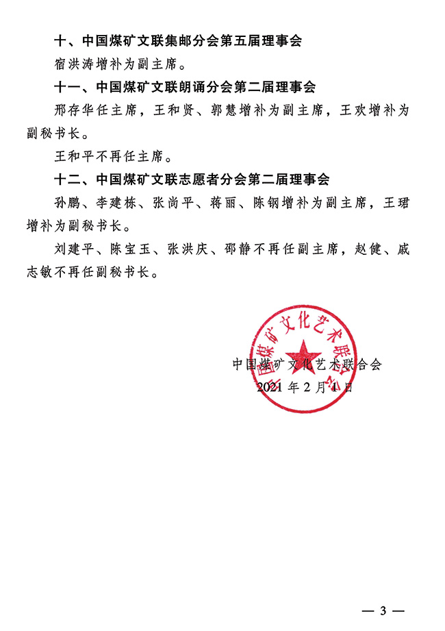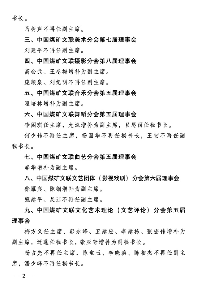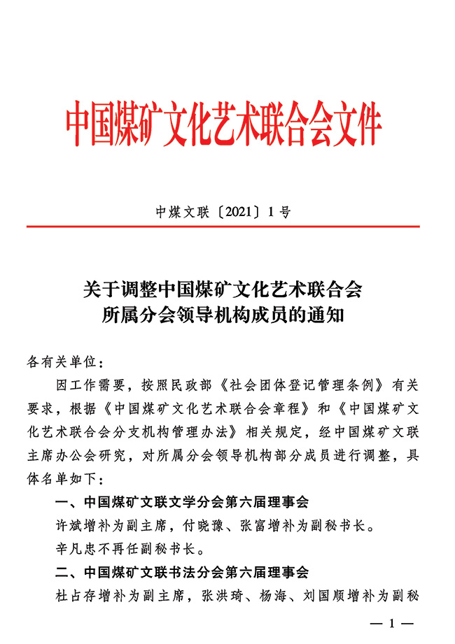 關于調整中國煤礦文化藝術聯合會所屬分會領導機構成員的通知 來源: 作者: 時間:2021-02-05 【字體:小 大】 關于調整中國煤礦文化藝術聯合會所屬分會領導機構成員的通知(PDF版) 分享到: 【打印正文】