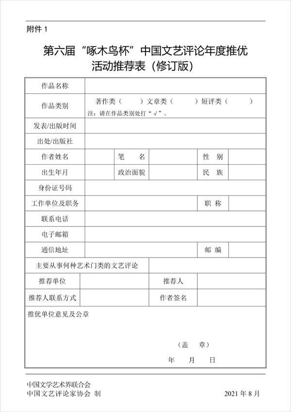 其他要求請參見《中國文聯辦公廳關于舉辦第六屆“啄木鳥杯”中國文藝評論年度推優活動的通知》(文聯辦發〔2021〕63號)。