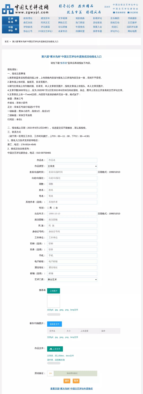 7. 申報單位將推薦表連同作品一起寄送至中國文藝評論家協(xié)會,在信封明顯位置處注明:第六屆“啄木鳥杯”報送材料。確保線上線下同步提交,以免造成報名不成功。