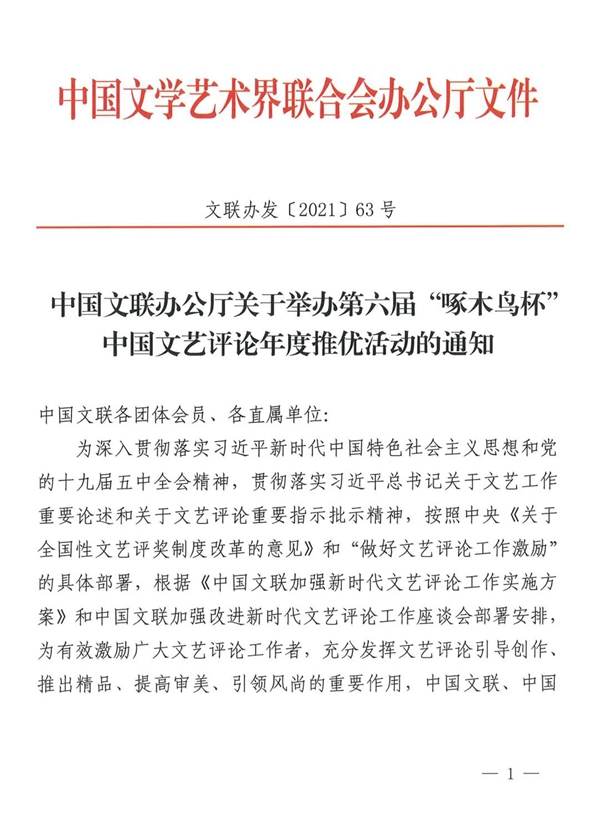 中國文聯(lián):第六屆“啄木鳥杯”中國文藝評論年度 推優(yōu)活動通知