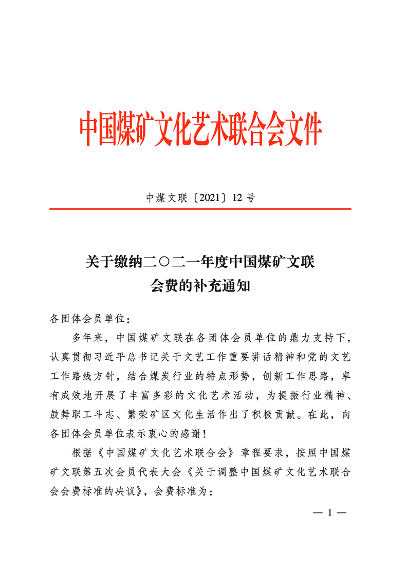 關于繳納二○二一年度中國煤礦文聯(lián)會費的補充通知