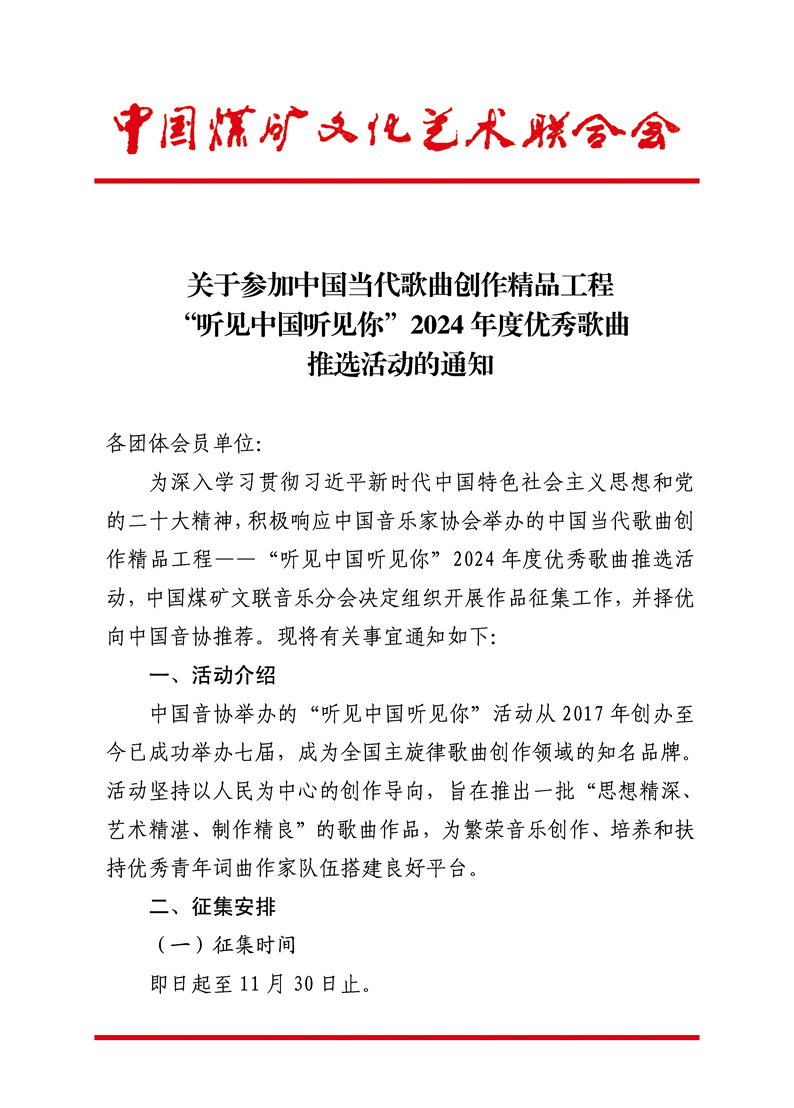 關于參加中國當代歌曲創作精品工程“聽見中國聽見你”2024年度優秀歌曲推選活動的通知