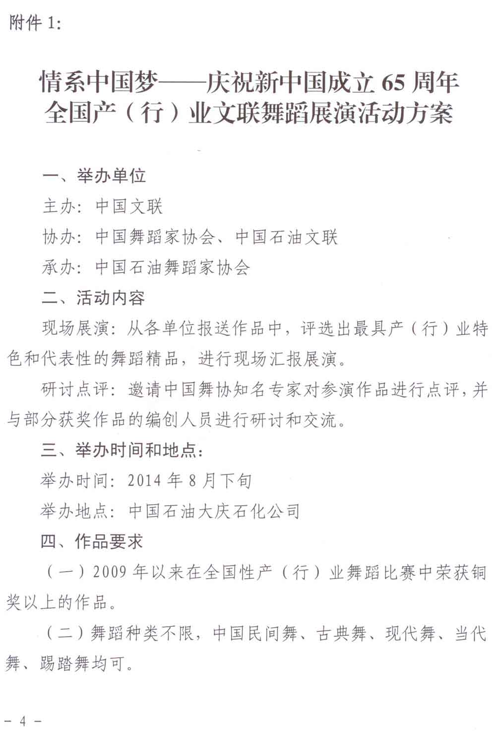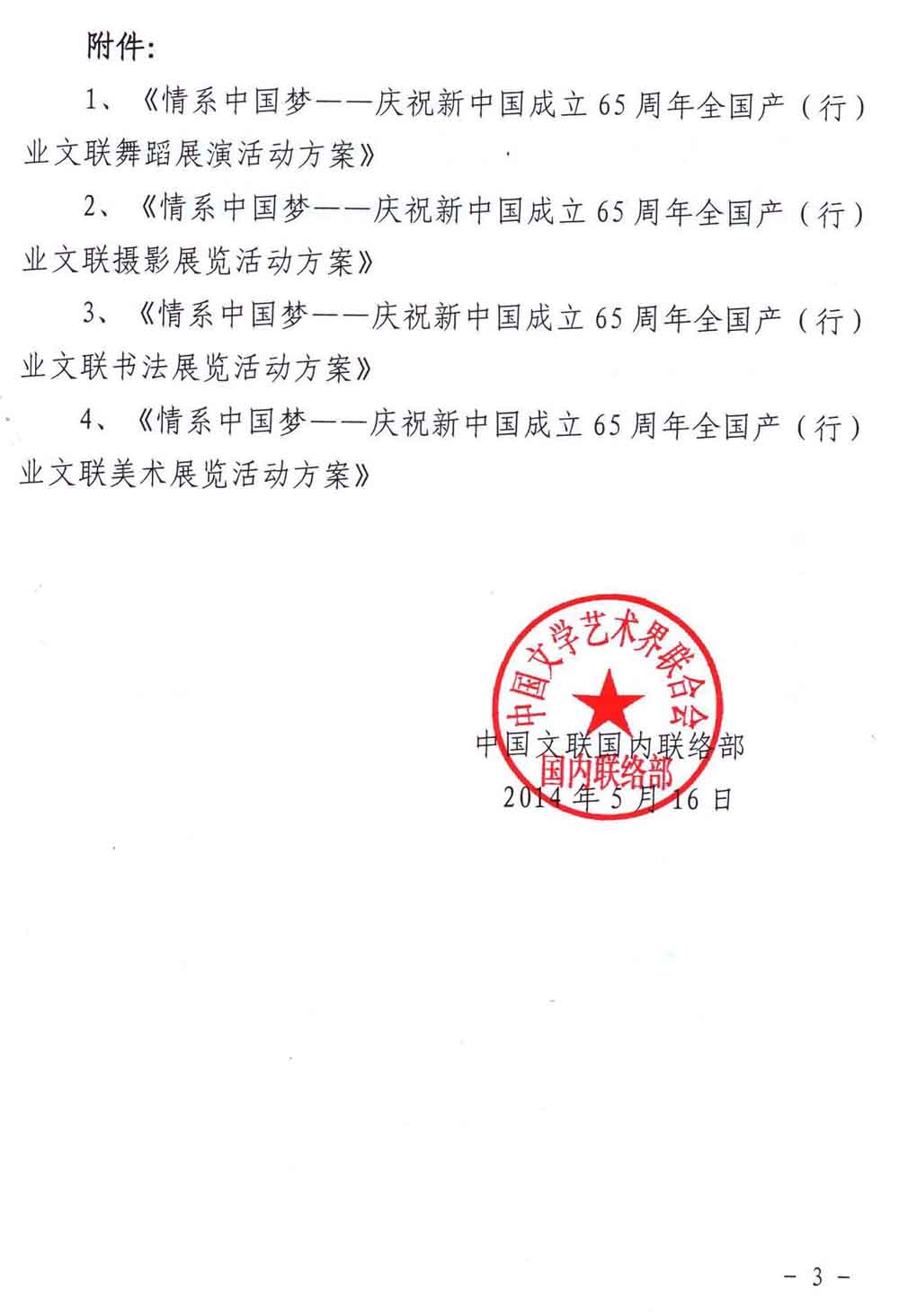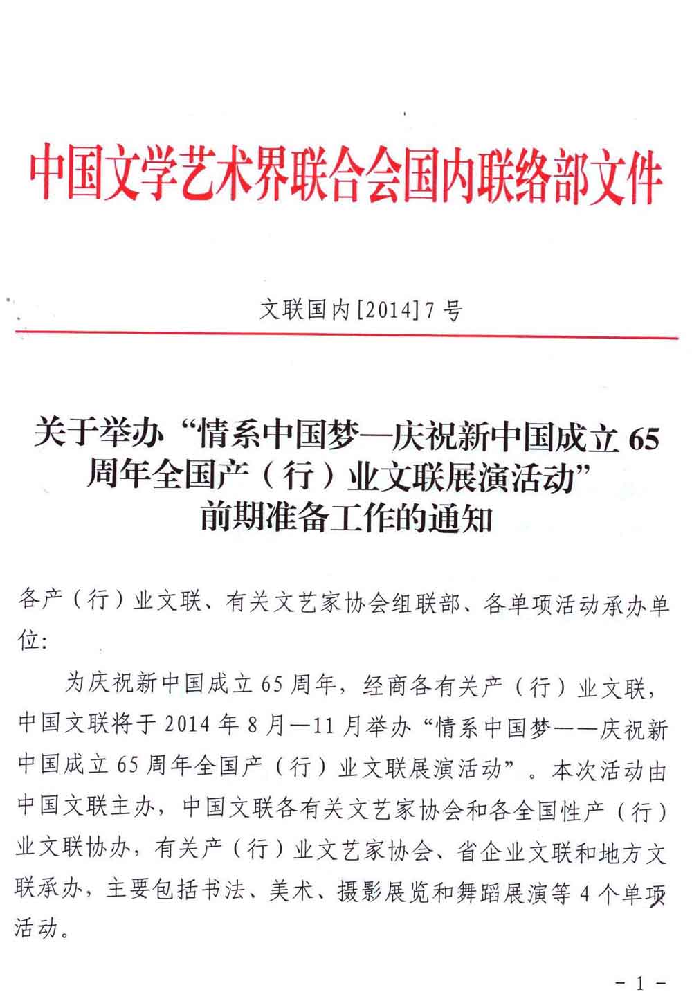 中國文聯《關于舉辦“情系中國夢——慶祝新中國成立65周年系列展演活動”的通知》