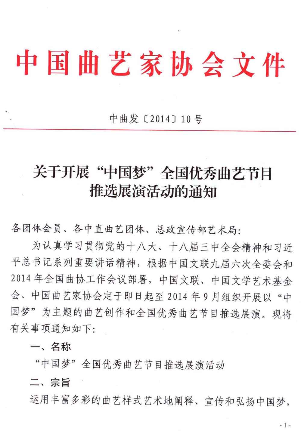 中國曲協《關于開展“中國夢”全國優秀曲藝節目推選展演活動的通知》