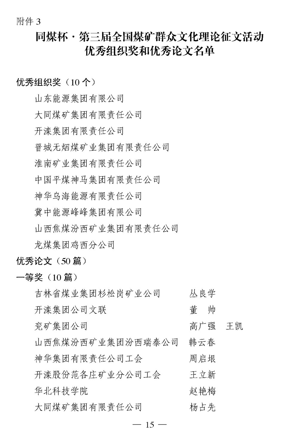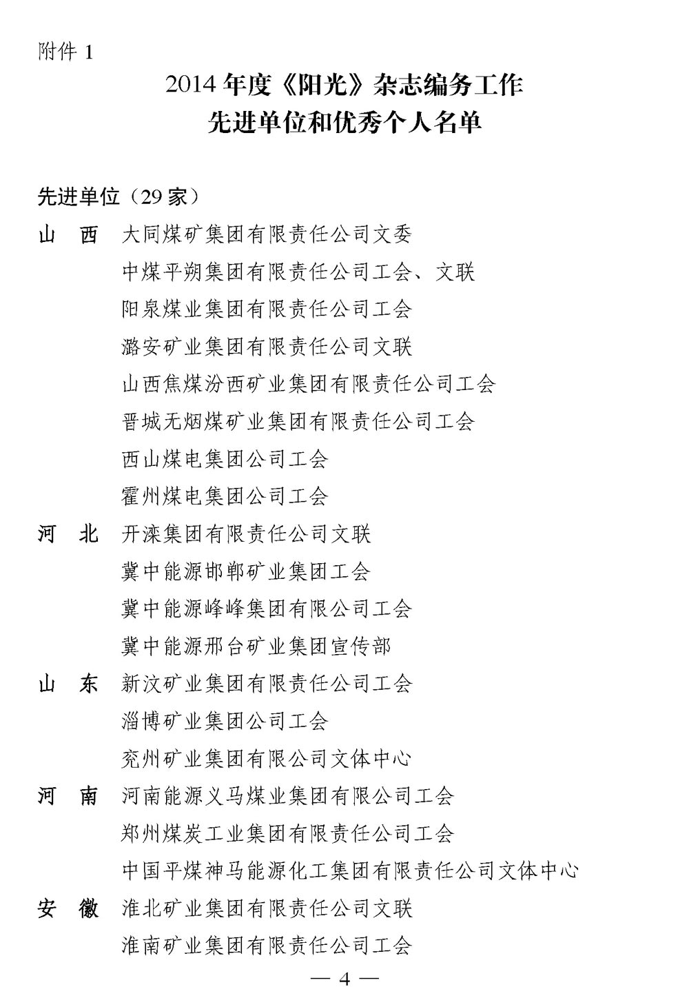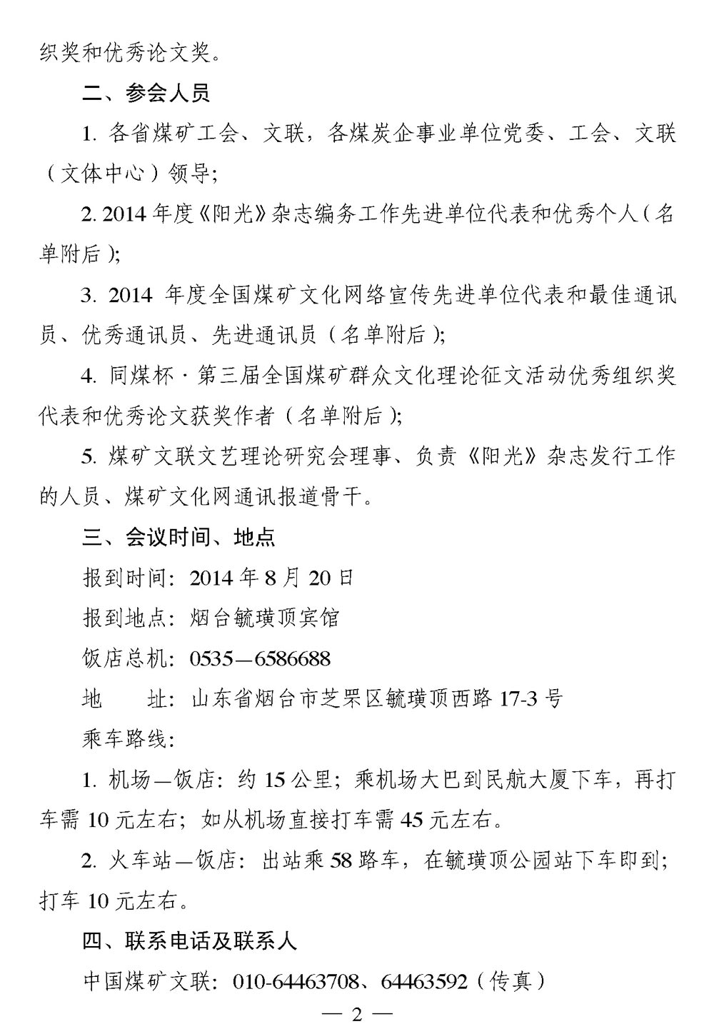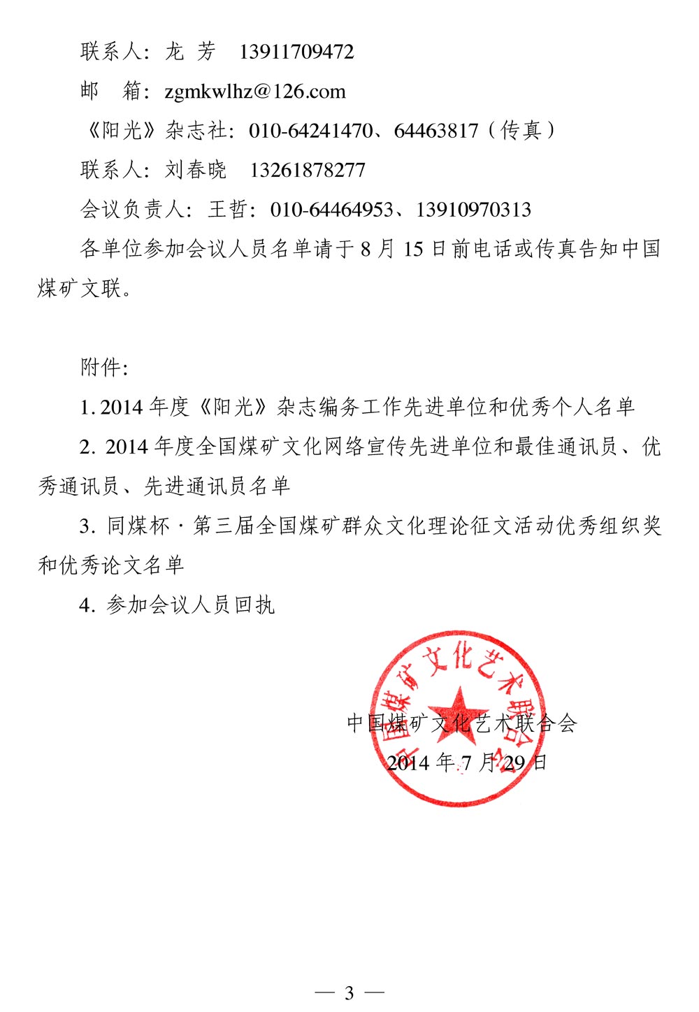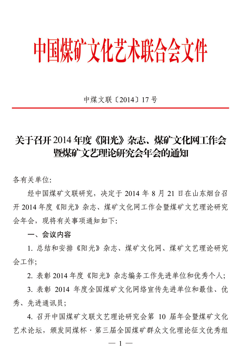 關于召開2014年度《陽光》雜志、煤礦文化網工作會暨煤礦文藝理論研究會年會的通知 來源:中國煤礦文聯 作者: 時間:2014-07-31 【字體:小 大】 附件: 1. 2014年度《陽光》雜志編務工作先進單位和優秀個人名單 2. 2014年度全國煤礦文化網絡宣傳先進單位和最佳通訊員、優秀通訊員、先進通訊員名單 3. 同煤杯·第三屆全國煤礦群眾文化理論征文活動優秀組織獎和優秀論文名單 4. 參加會議人員回執 分享到: 【打印正文】