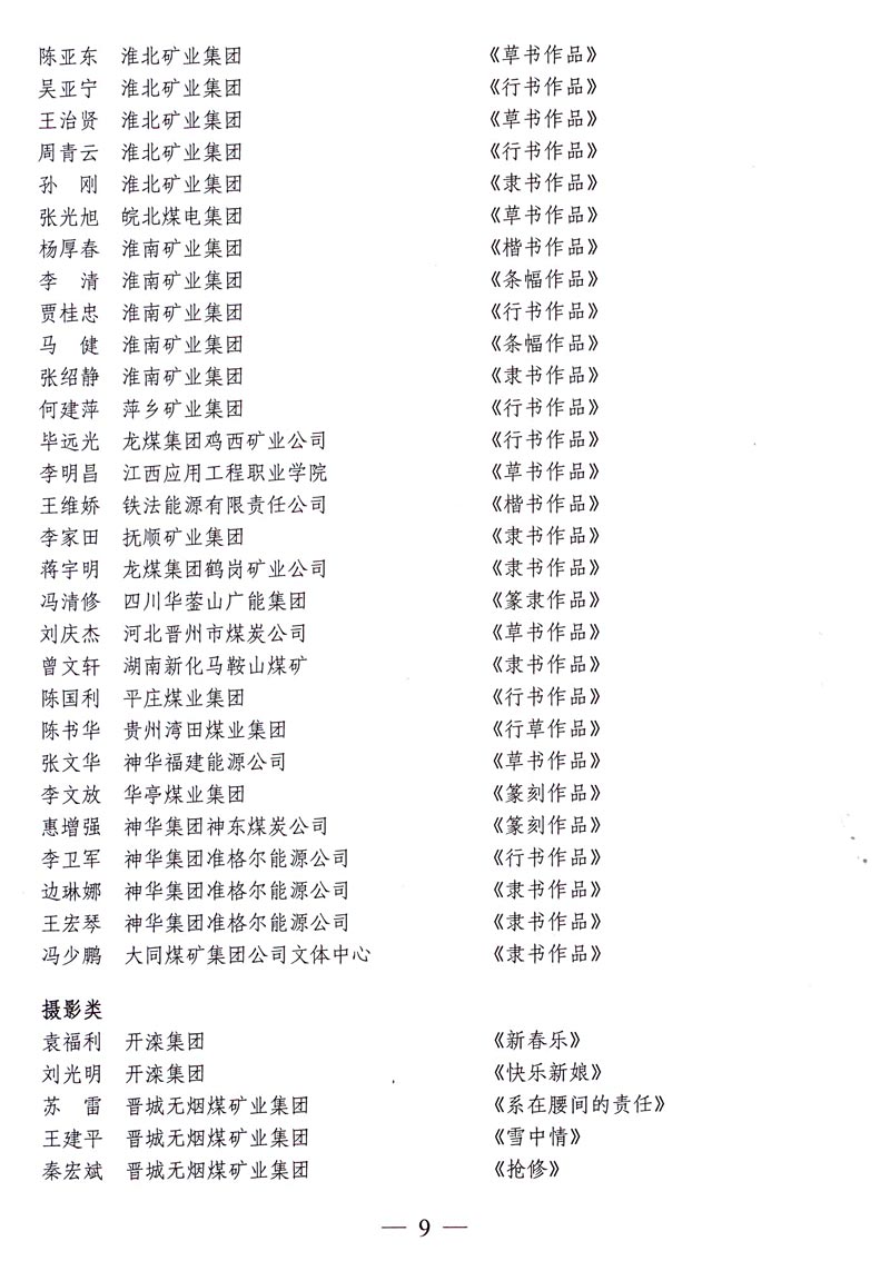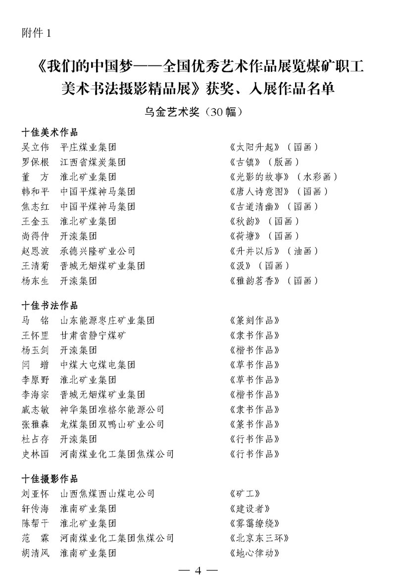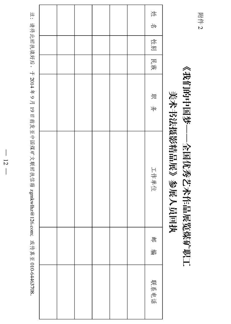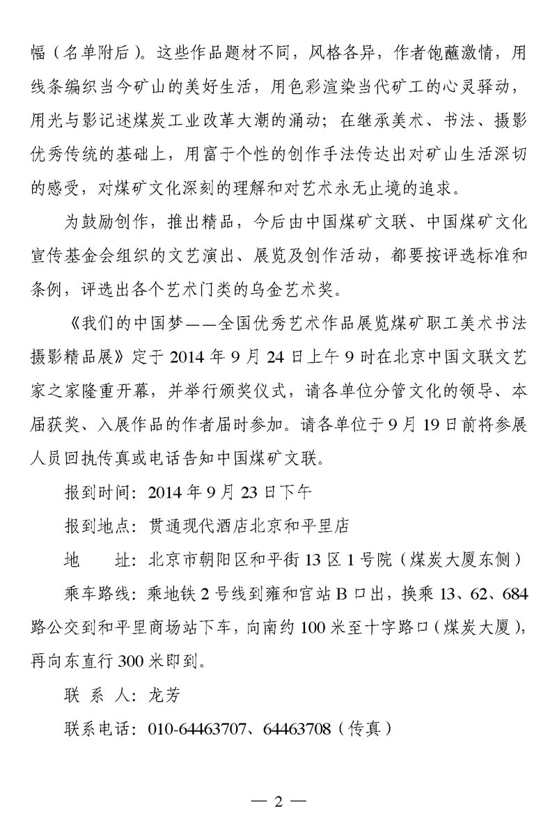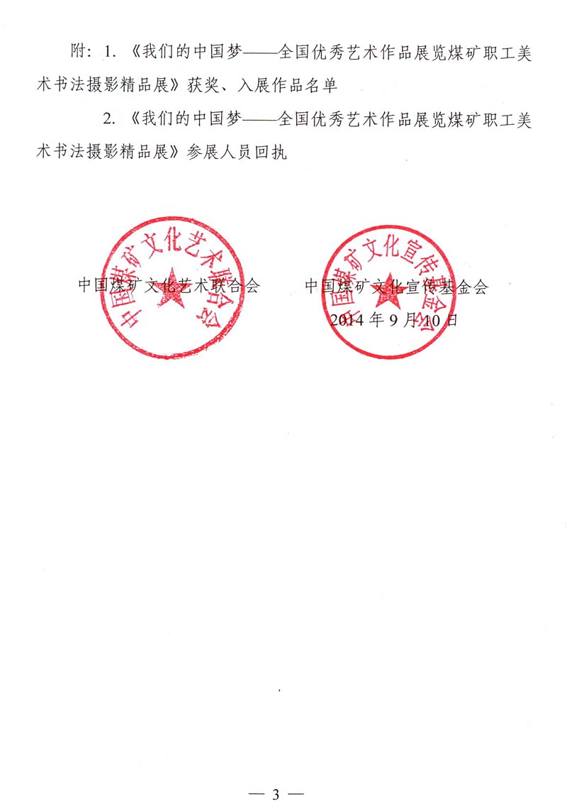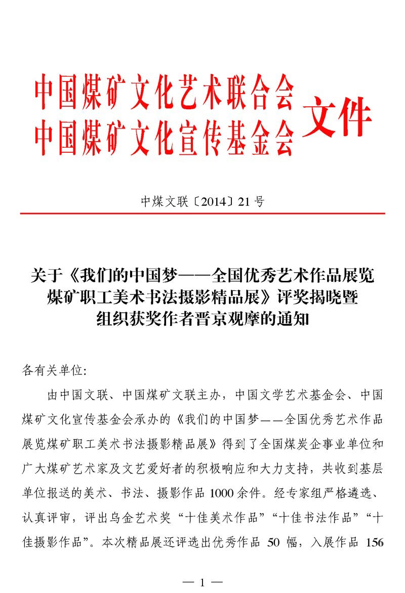 關(guān)于《我們的中國夢——全國優(yōu)秀藝術(shù)作品展覽煤礦職工美術(shù)書法攝影精品展》評(píng)獎(jiǎng)揭曉暨組織獲獎(jiǎng)作者晉京觀摩的通知 來源:中國煤礦文聯(lián) 作者:中國煤礦文聯(lián) 時(shí)間:2014-09-12 【字體:小 大】 附件1.《我們的中國夢全國優(yōu)秀藝術(shù)作品展覽煤礦職工美術(shù)書法攝影精品展》獲獎(jiǎng)、入展作品名單 附件2.《我們的中國夢全國優(yōu)秀藝術(shù)作品展覽煤礦職工美術(shù)書法攝影精品展》參展人員回執(zhí) 分享到: 【打印正文】