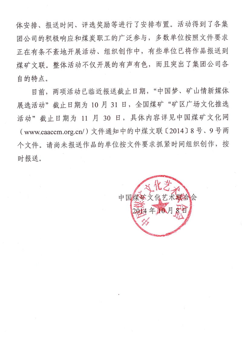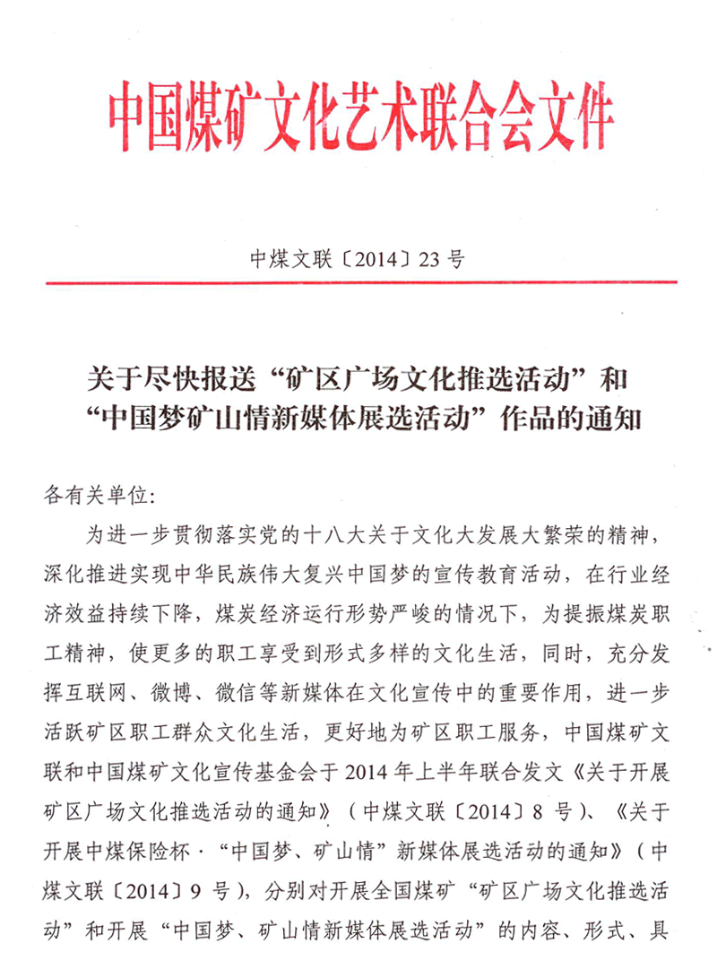 關于盡快報送“礦區廣場文化推選活動”和“中國夢礦山情新媒體展選活動”作品的通知